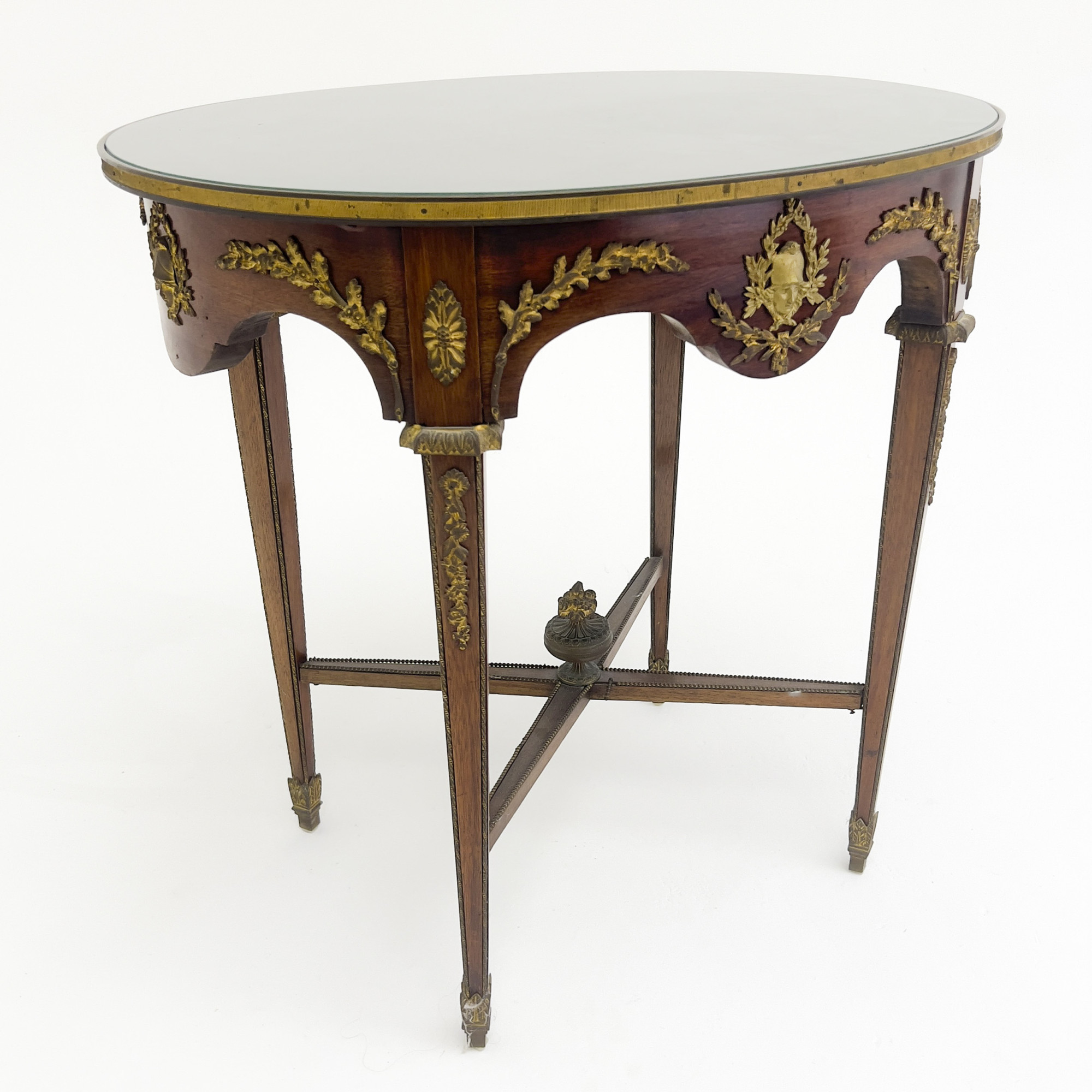 Oval single drawer parquetry table, inset glass top over parquetry veneer, with ormolu mounts, supported by square tapered legs, joined by a cross stretcher with an urn finial