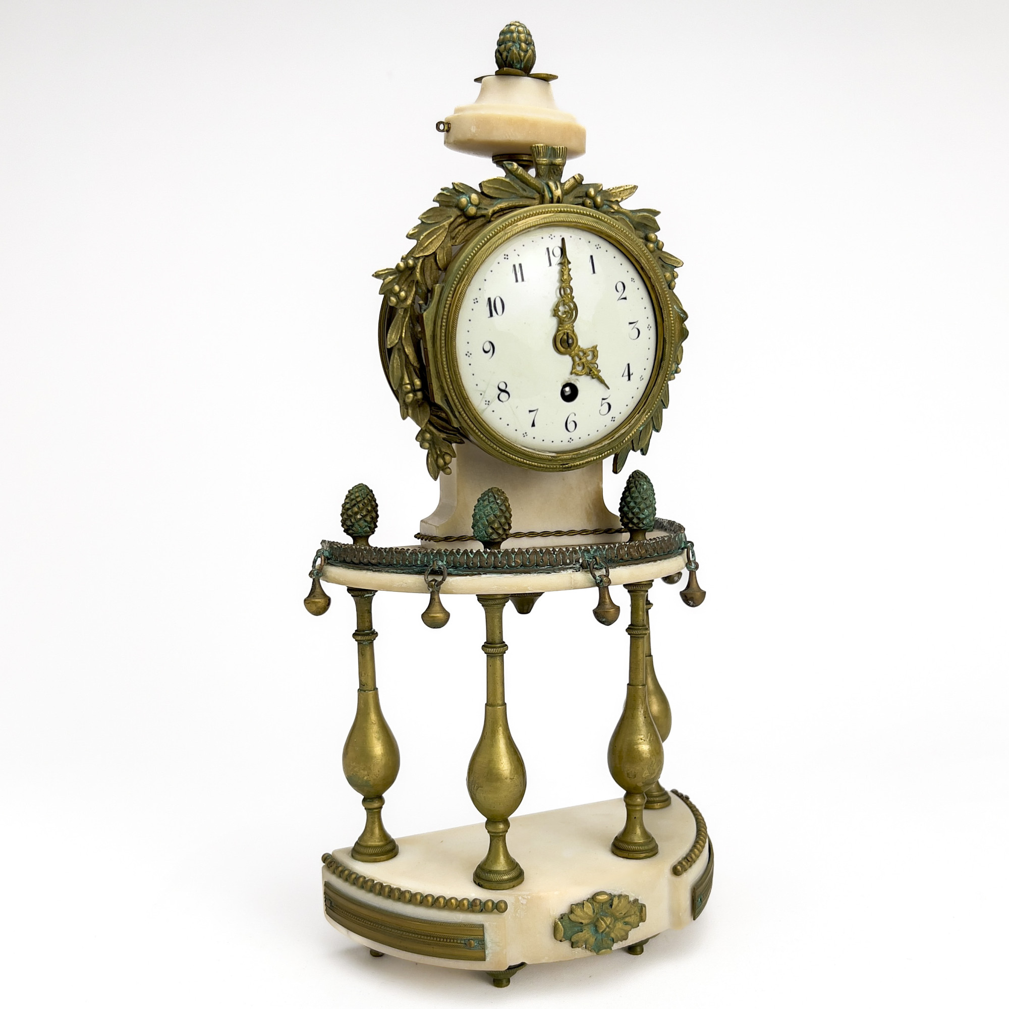 Mantel clock with brass housing for clockworks mounted on a marble platform supported by brass colonnades, and decorated with pineapple finials, clockworks housing with encircling brass wreath, dial with Arabic numerals, unmarked.