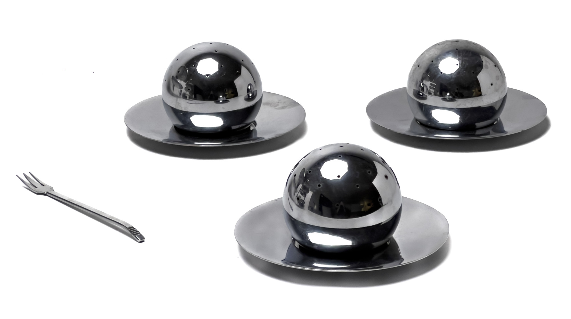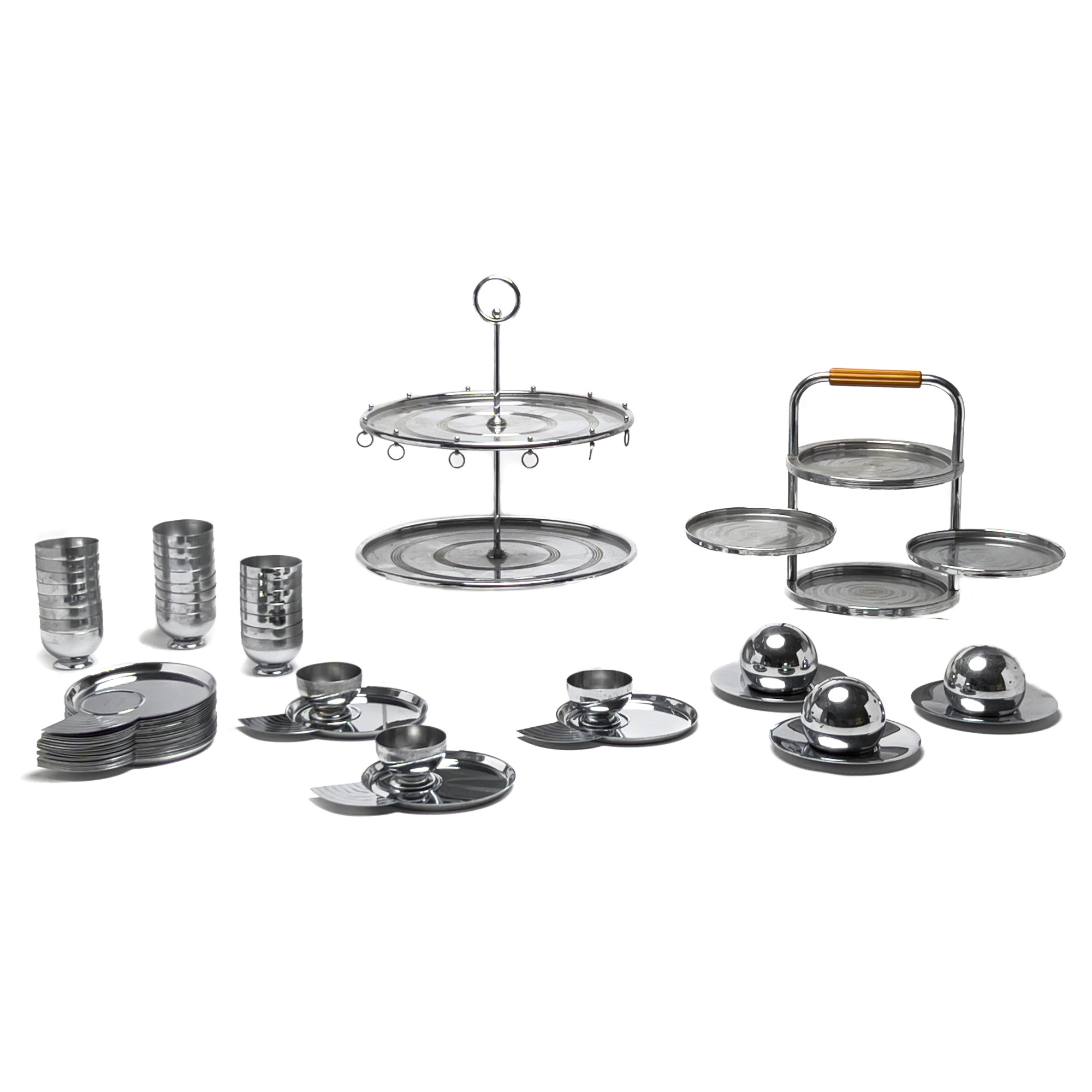 Comprising 3 cocktail balls, 1 four-in-hand serving tray, 1 cocktail canapé server, 1 fork, 26 individual canapé plates, and 26 cocktail cups