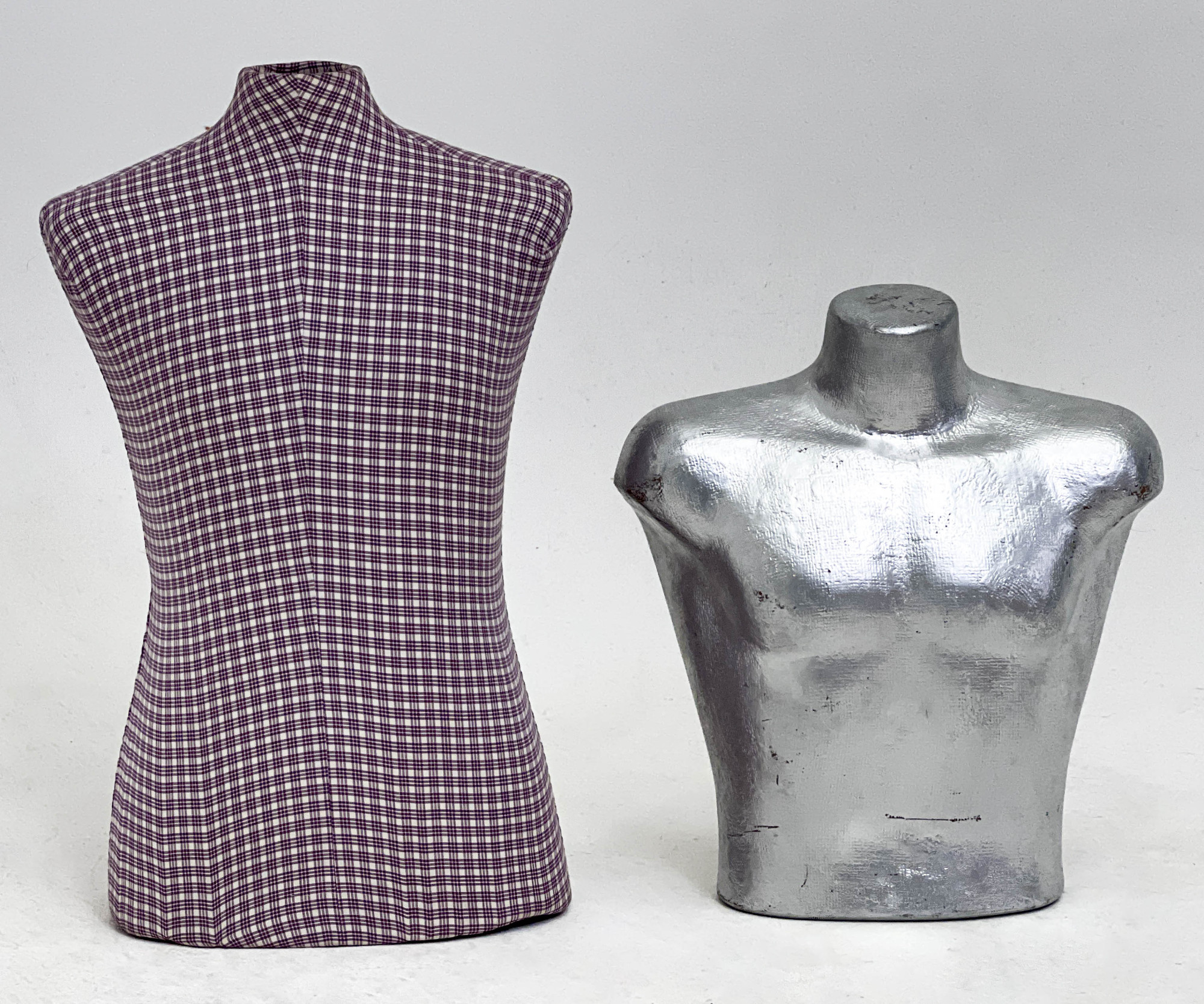 both are male dress forms, one in a red and white tattersall pattern, one a textured silver painted plastic male torso