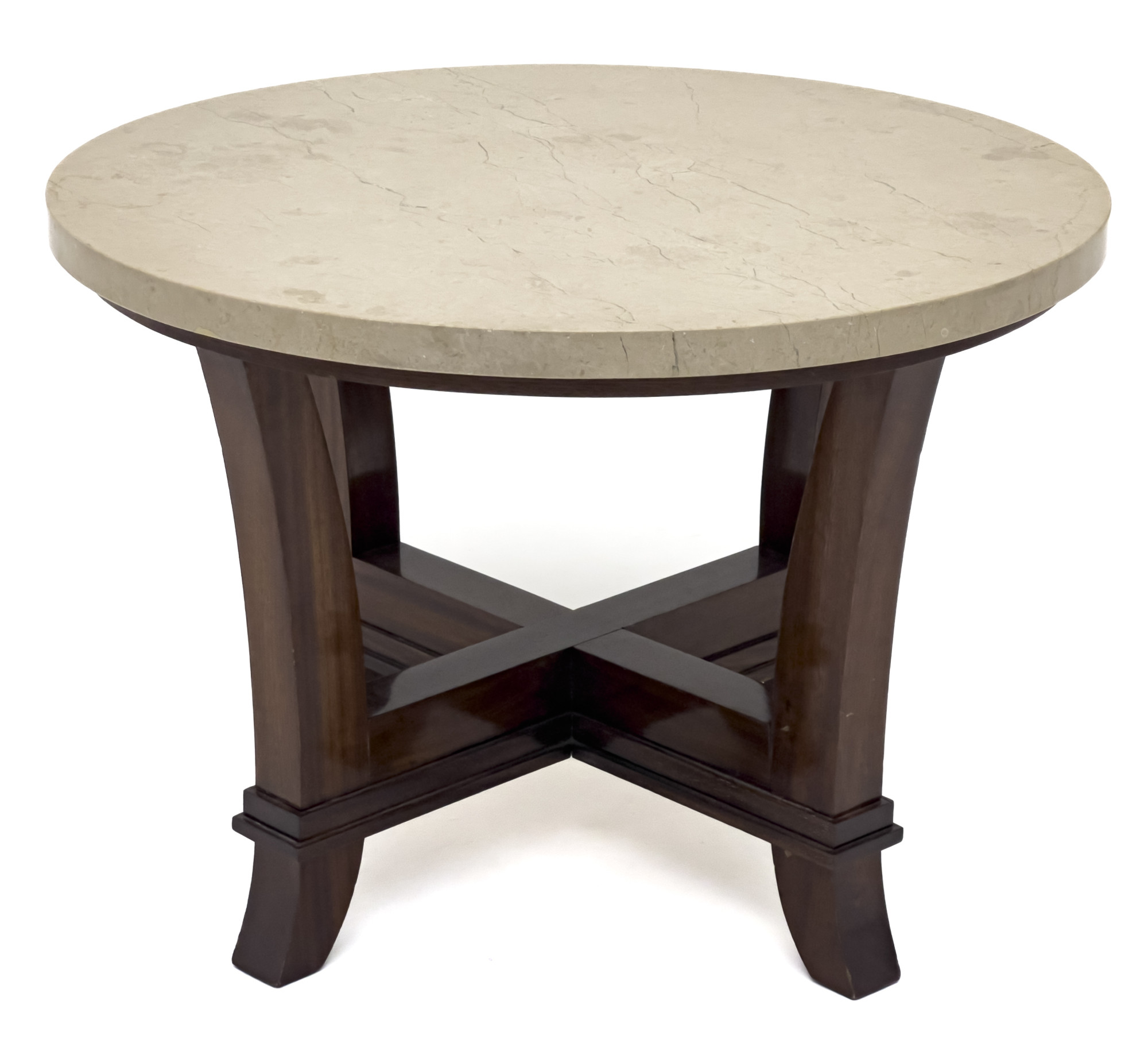 Circular marble topped side table, with wood base raised on four legs joined by stretchers