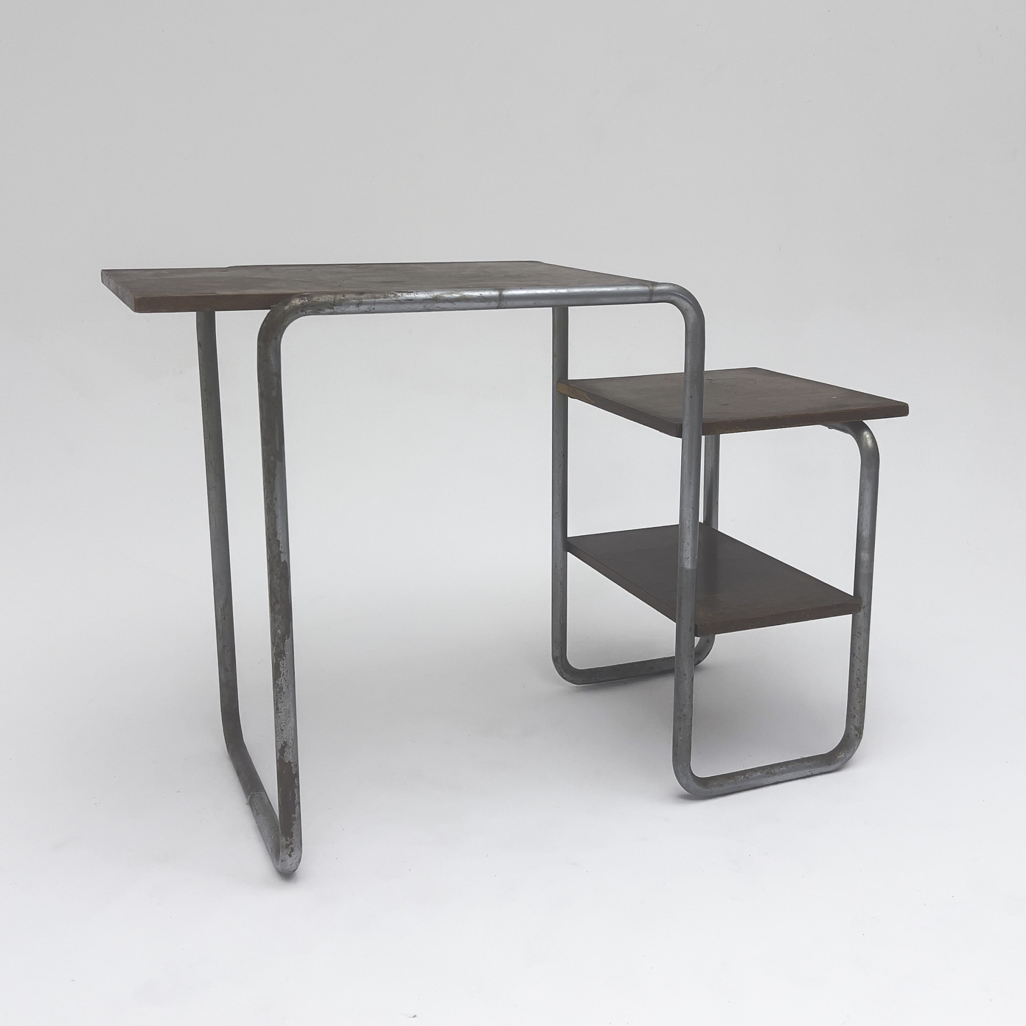 Tiered form, with walnut shelves set in chromed tubular steel frame