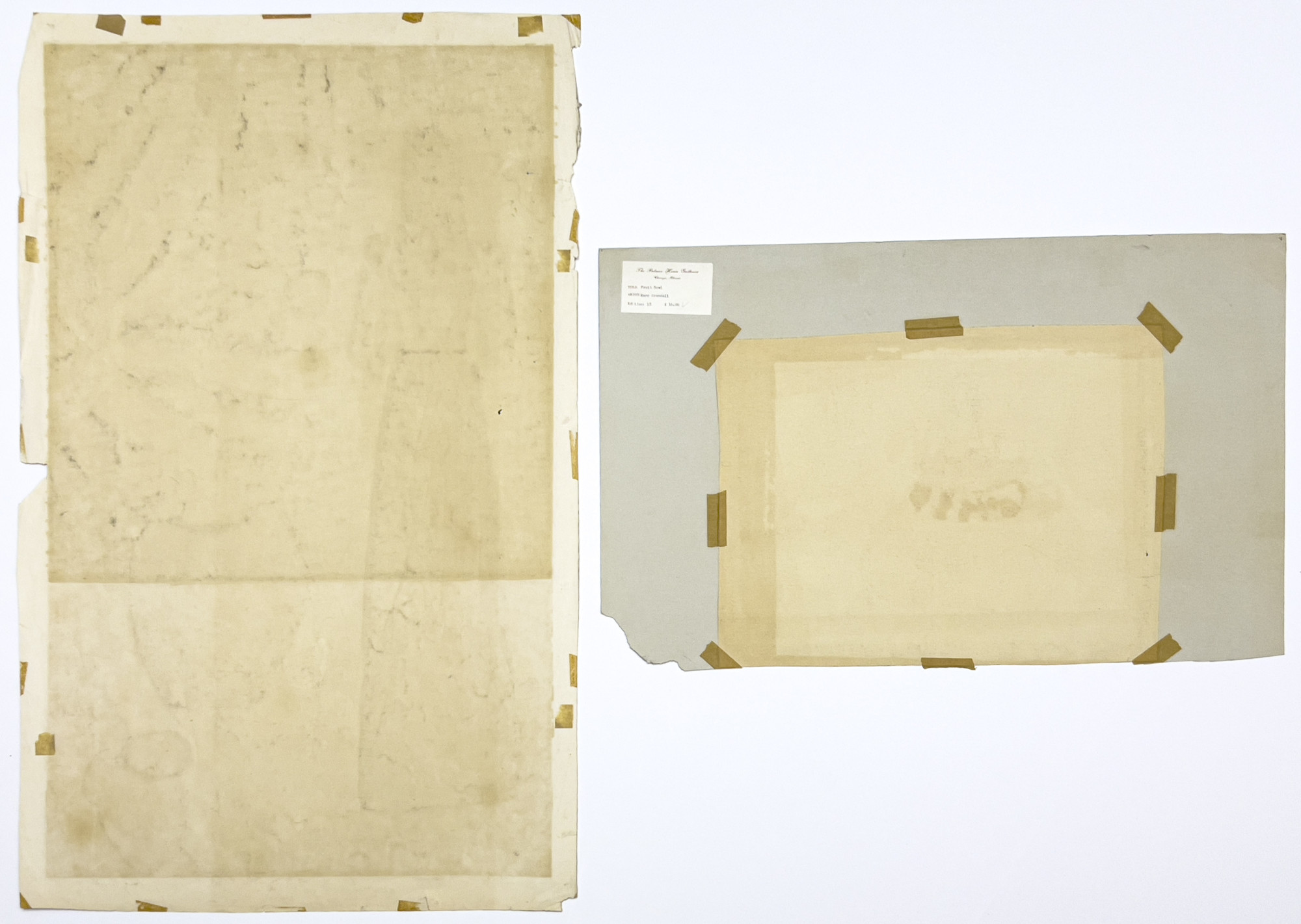 larger with several tears/losses to margins, as well as stress cracks, smaller with scattered abrasions and resulting losses, each with toning