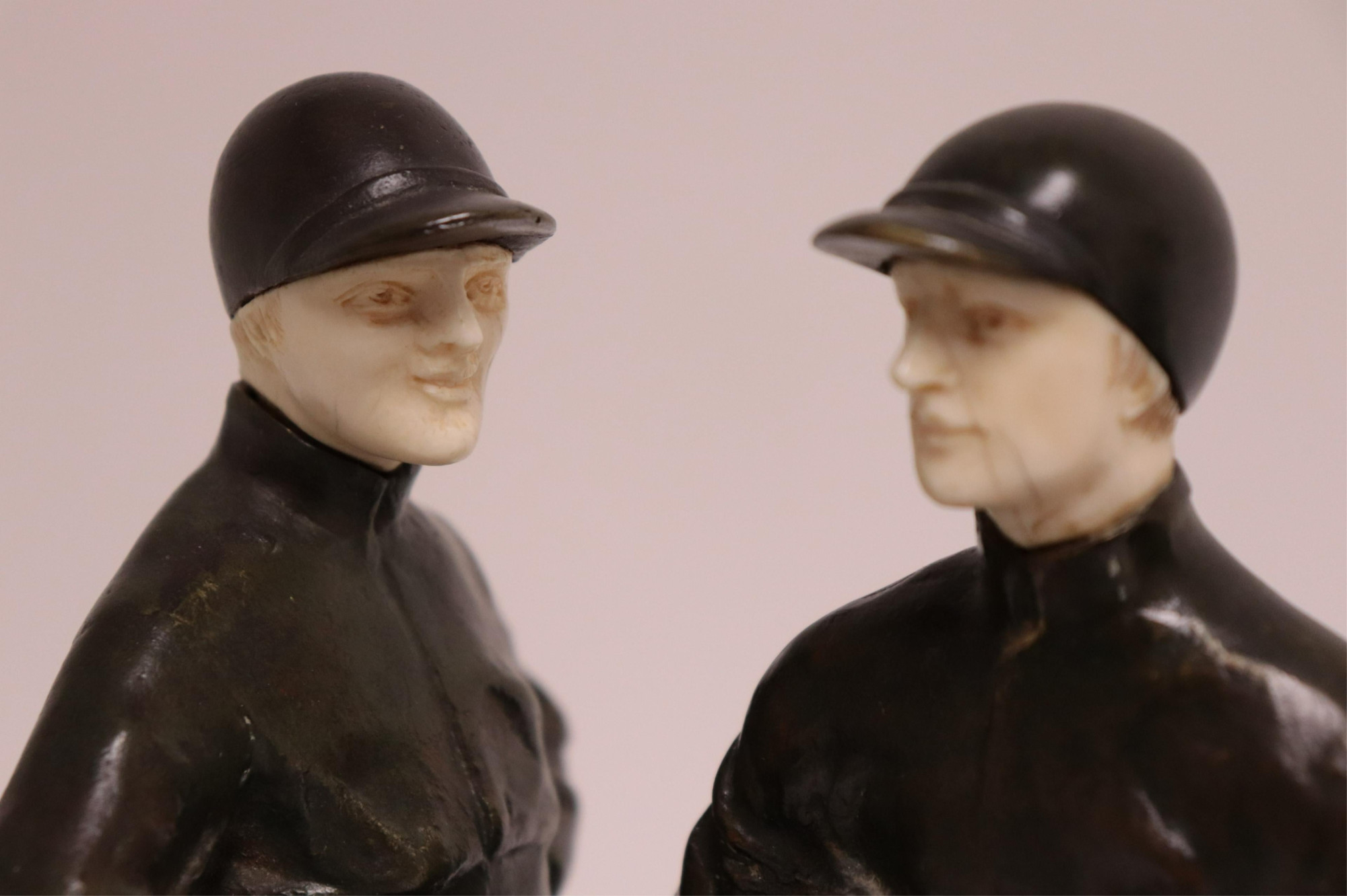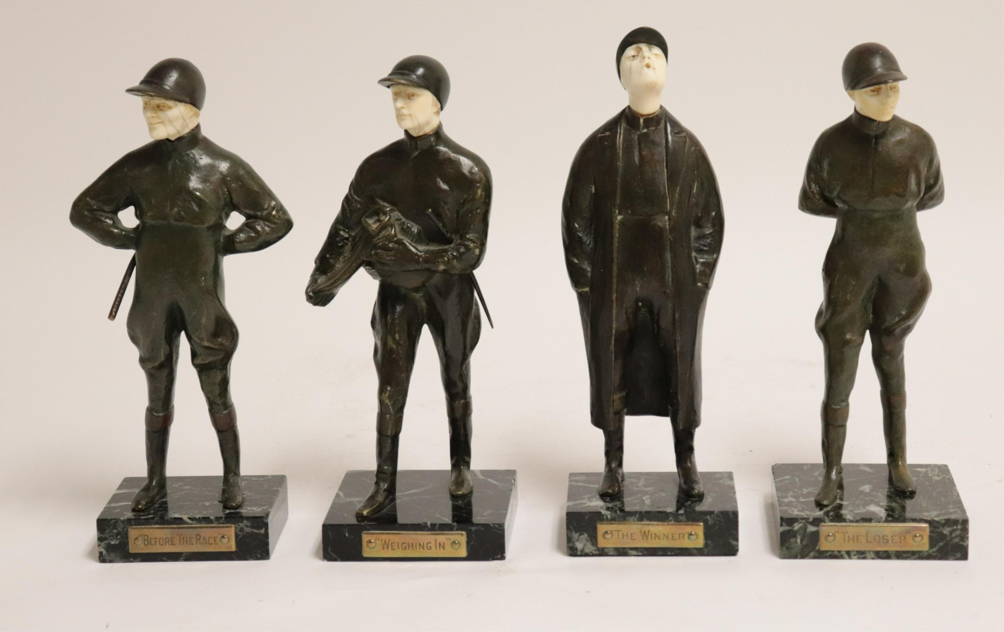 Maurice Giraud-Riviere, 1881-1947, Series of 4 Bronze Equestrian Figures, cast after a model, "Weighing In", "Before the Race", "The Winner", and "The Loser", three inscribed on marble Guiraud Riviere and titled (4 pc.) (EBAZ619/4)(MS) Dimensions: Largest 10 1/4" H Property from the estate of Edward Bazinet