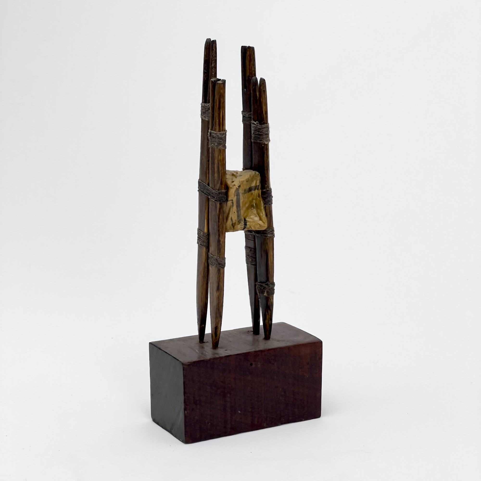 mixed media, wood, string, paper 7 1/2 x 3 1/8 x 1 1/2 inches