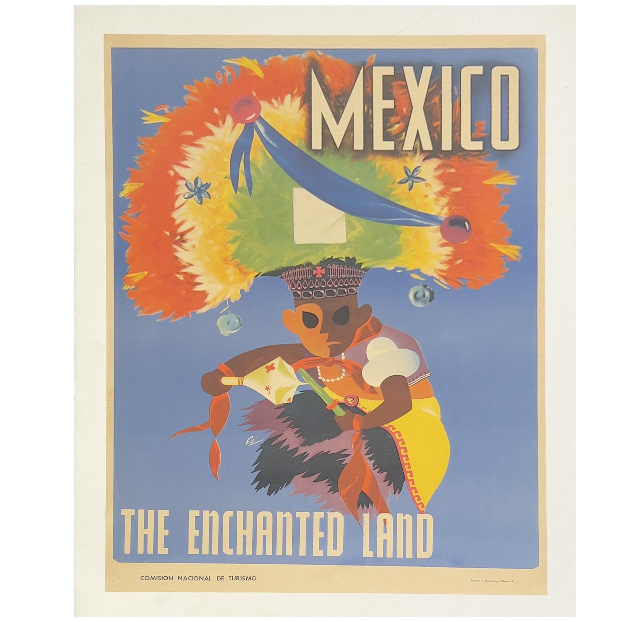 Mexican travel poster for the Comision Nacional de Turismo. Featuring a depiction of a dancer in traditional attire. Printed by Offset, S.A., Mexico.