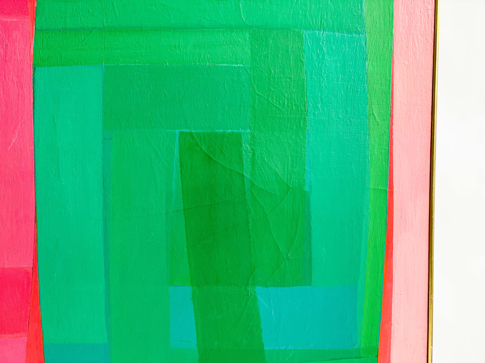 overall in good condition, medium is well attached to support, minor repair to bottom left, stress cracks mostly in the green area