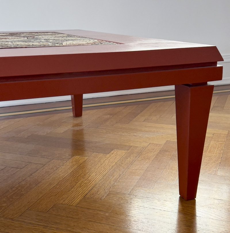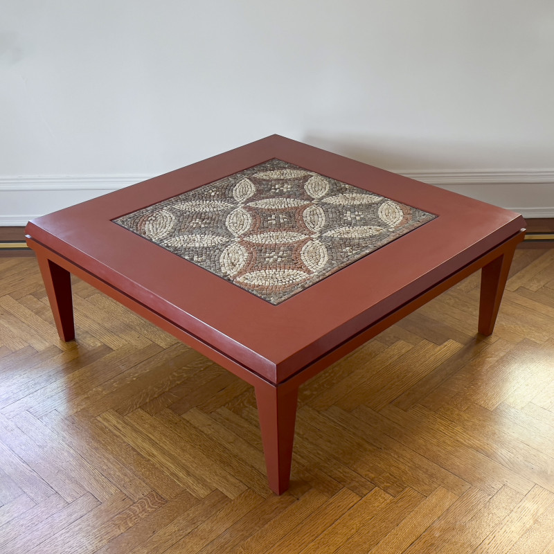 painted wood coffee table with centered inset Roman style geometric mosaic, rising on tapered legs