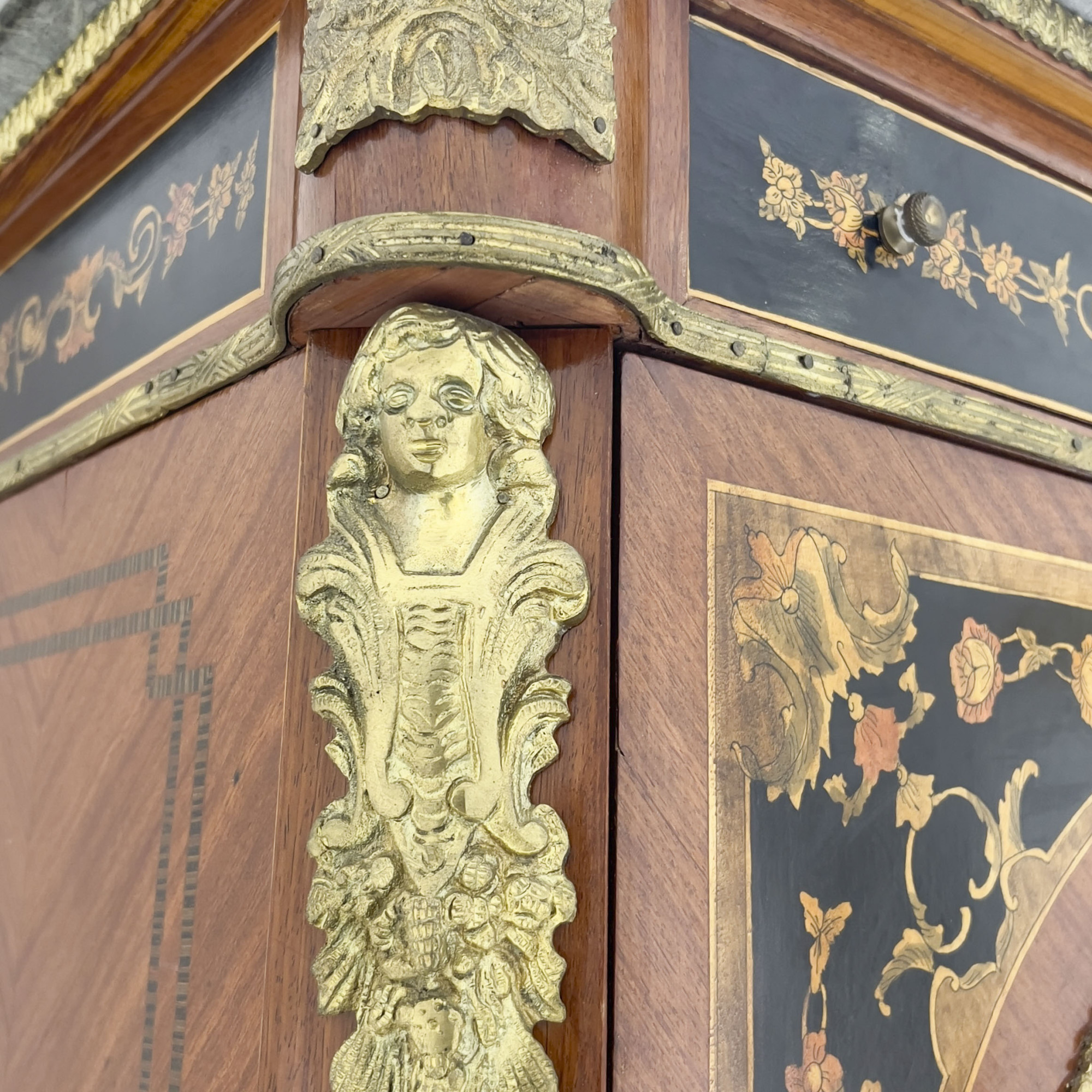 Second Empire style cabinet, stone top, floral marquetry, and ormolu mounts.