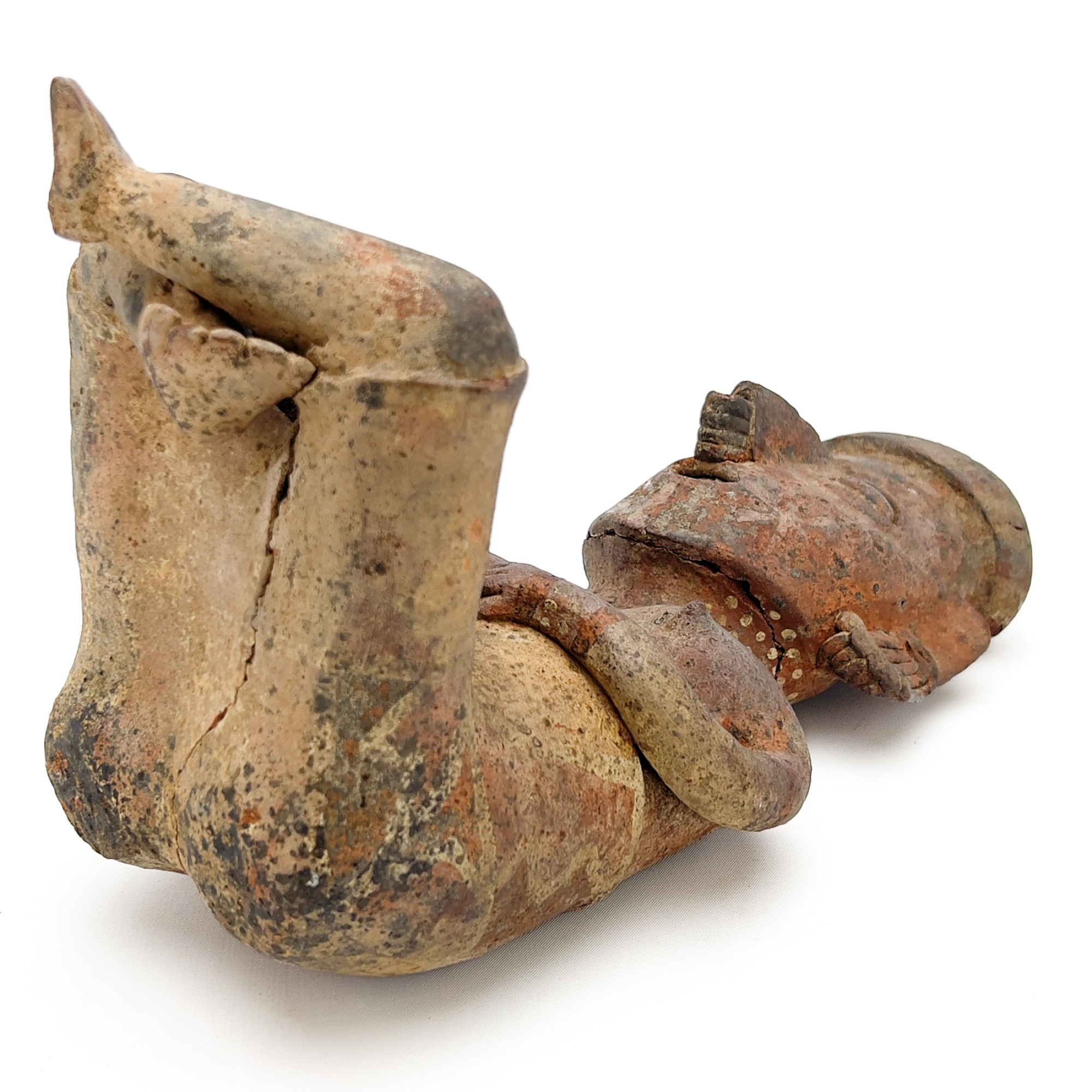 A Polychrome clay figure of a seated woman with elaborate jewelry holding a cup, raised on a wood plinth base, attributed to the 1st Millennium AD, with 1956 receipt from Andre Emmerich.