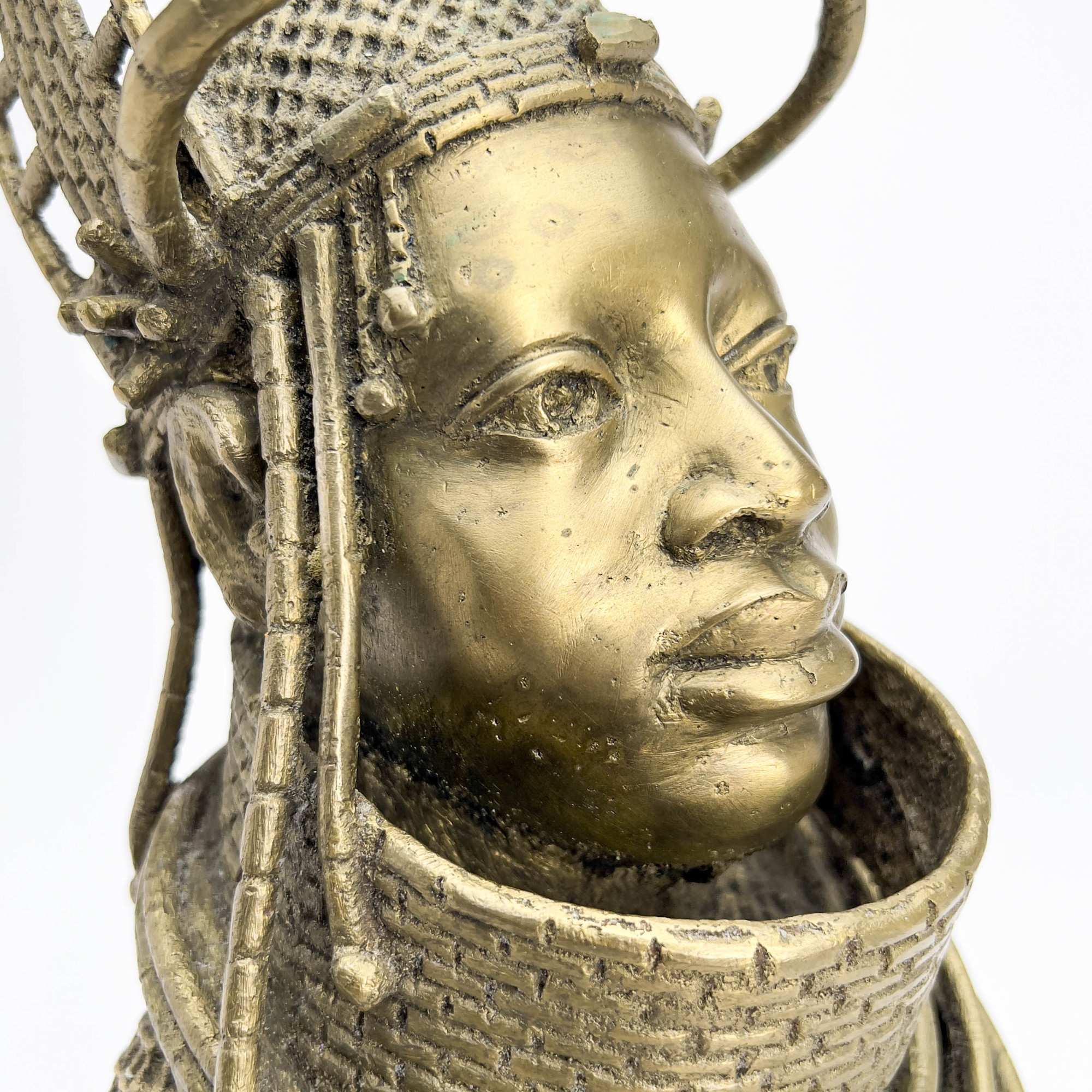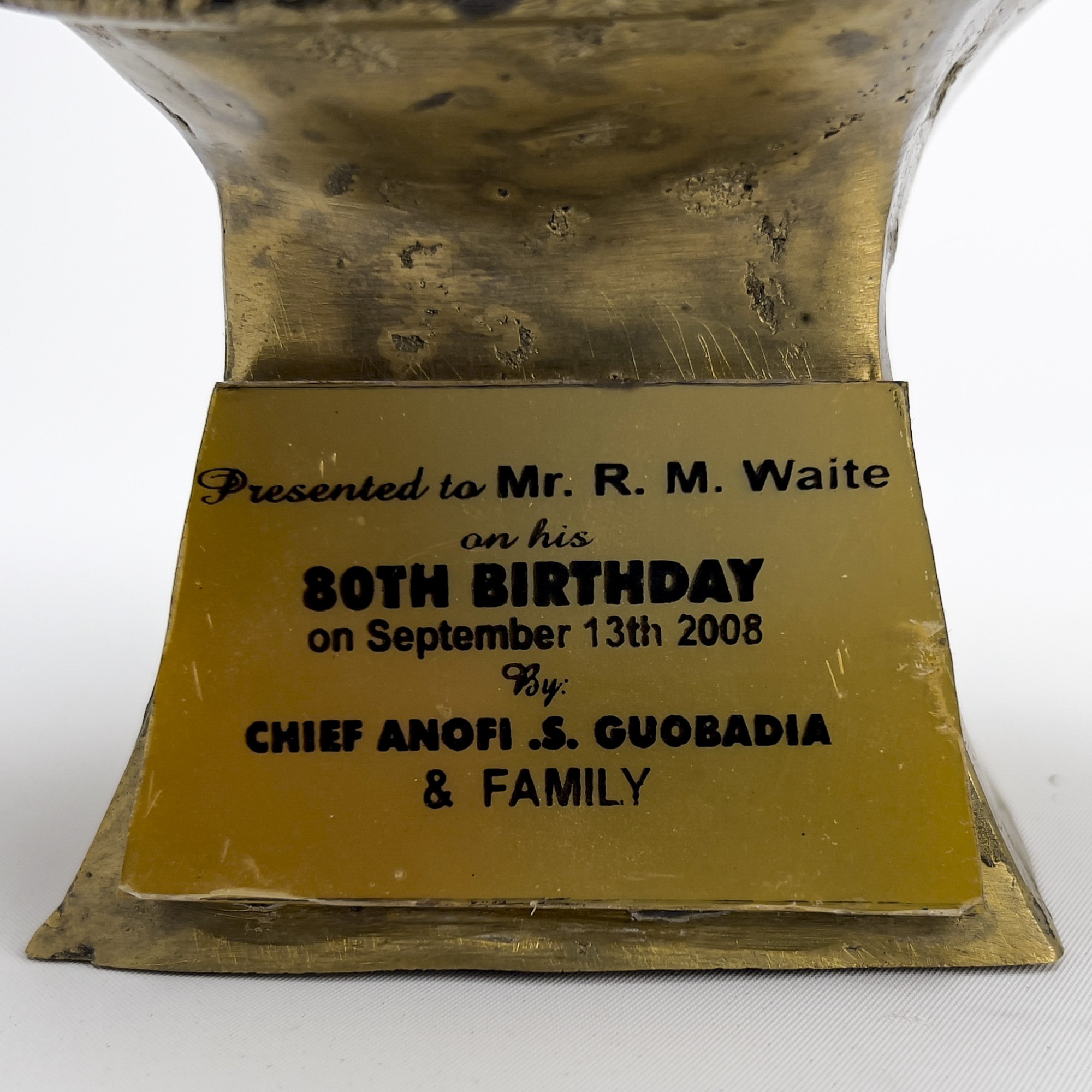 A cast of a king with a plaque affixed stating: gift from Chief Anofi S. Guobadia