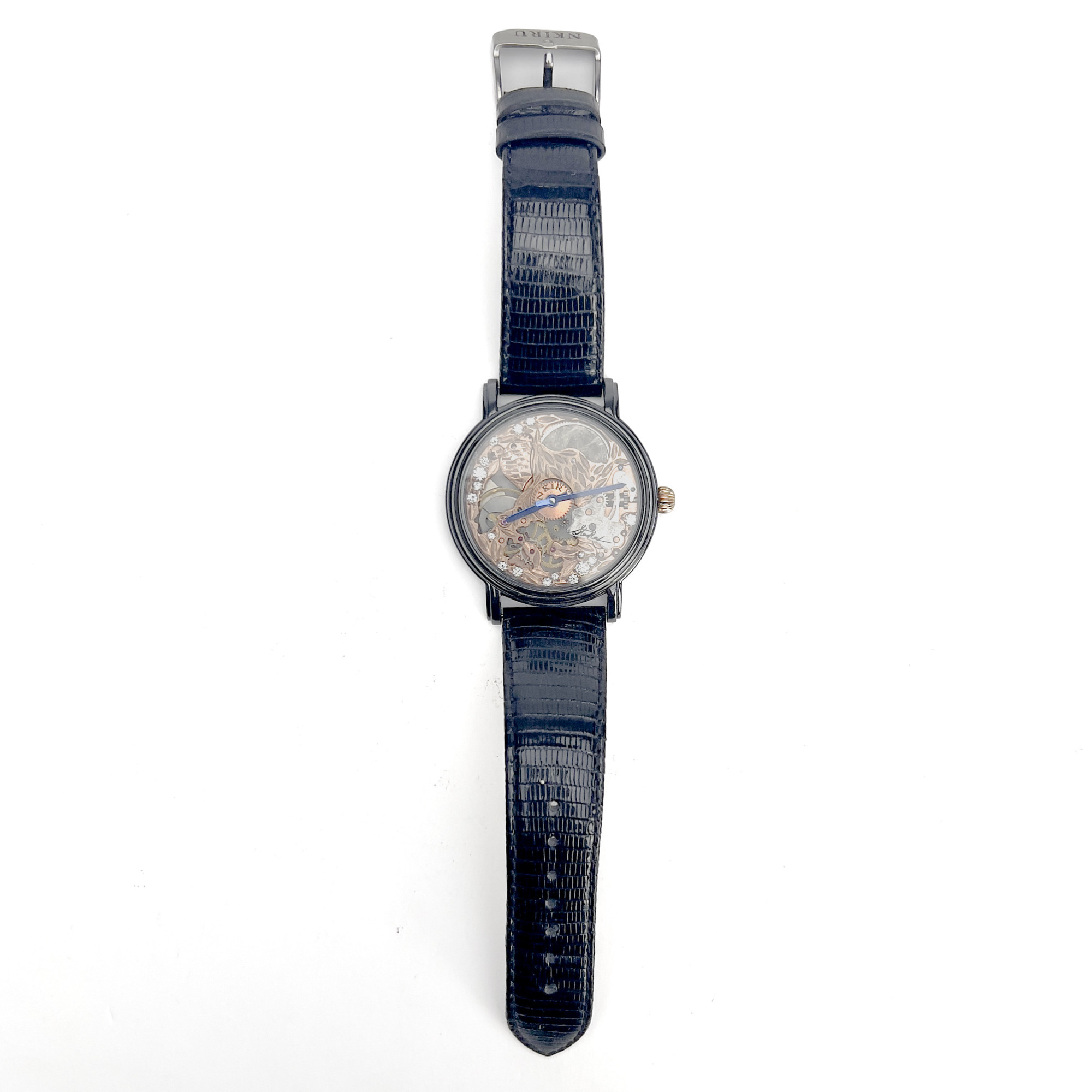 A gentleman's skeleton wristwatch with a circular stainless steel case, 17 jewels manual wound watch, mechanical parts made in precious metals, metallic blue hands and a rose gold face set with diamonds, signed Steven Richardson. With a black lizard-skin band by Vera Pelle