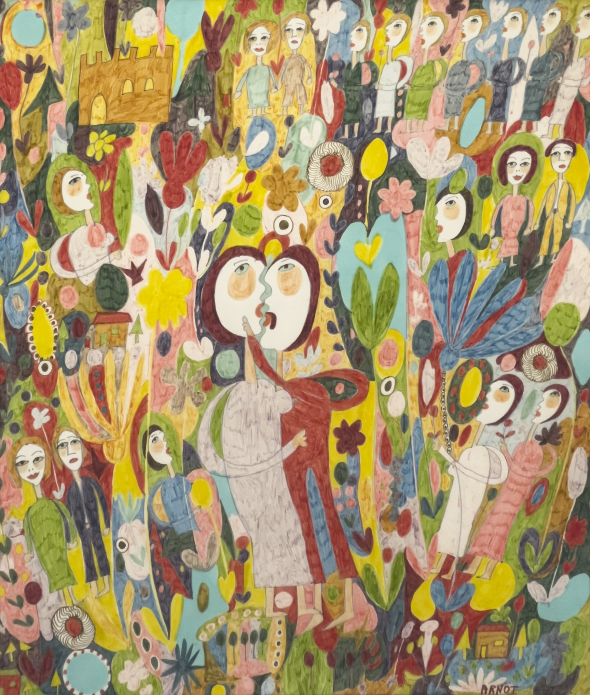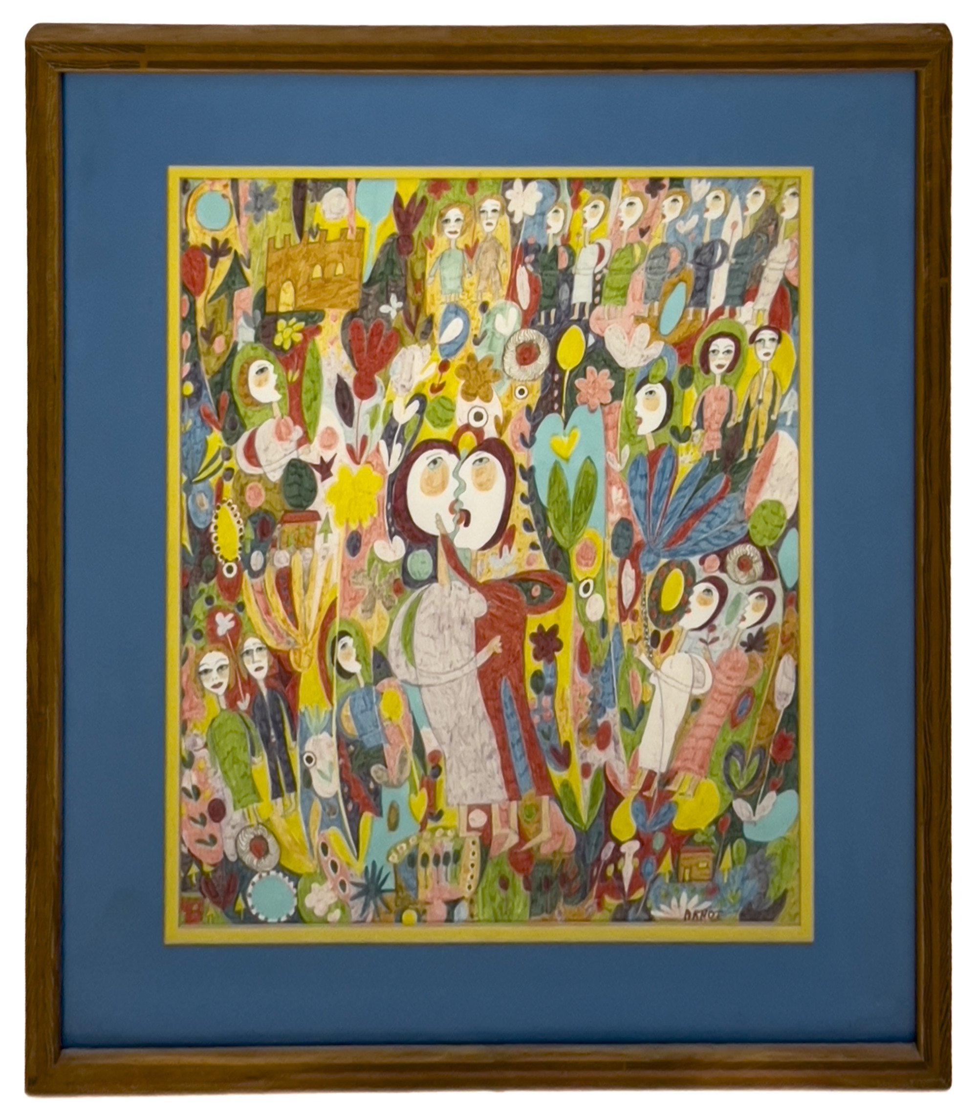 Outsider art drawing of a large figral group in floral setting with some scattered buildings