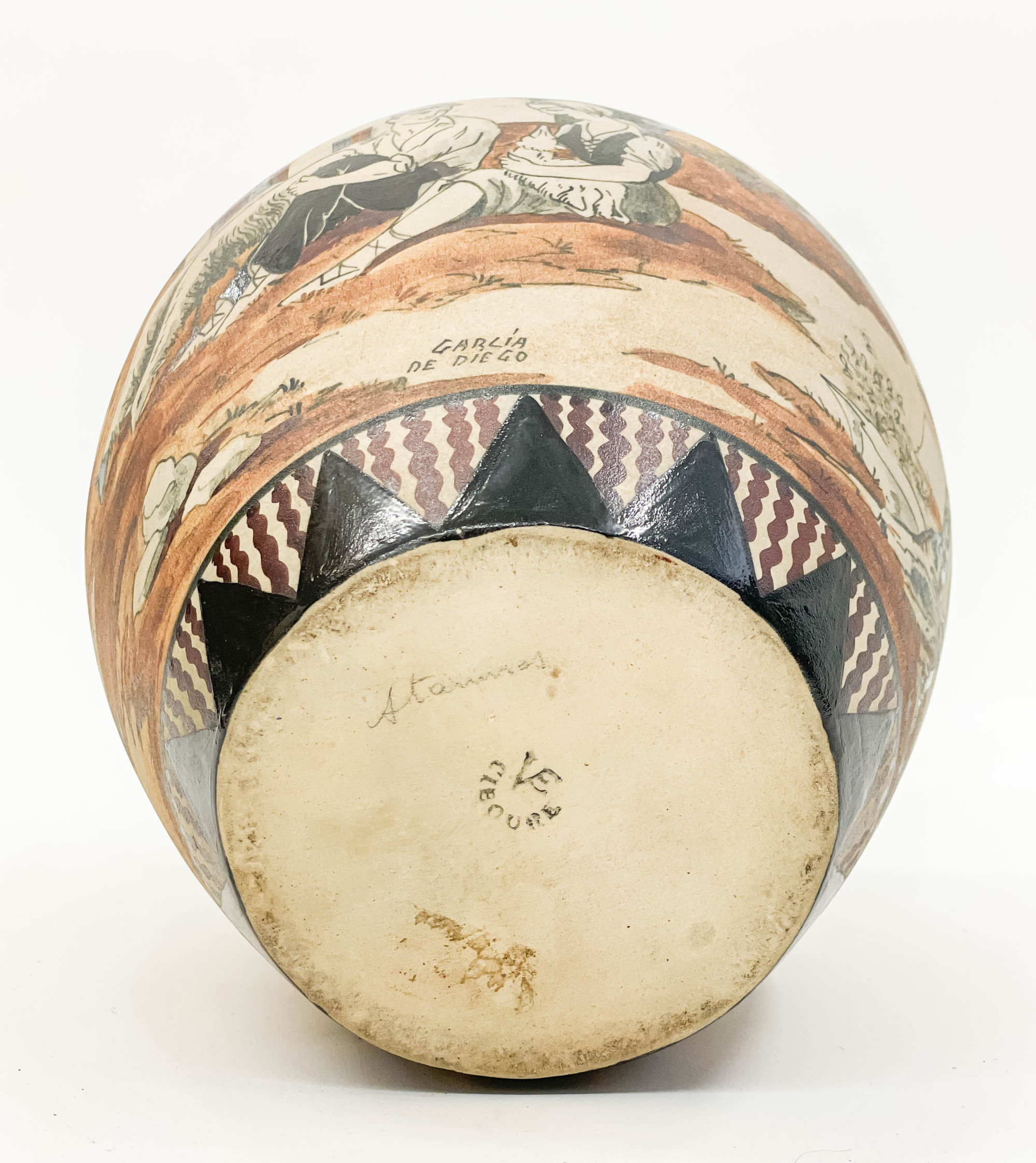 stoneware vase with two raise handles, one side depicting couple with sheep, the other side depicting men playing Jai Alai, Garcia De Diego signed on body, 'VE Ciboure' stamped on bottom