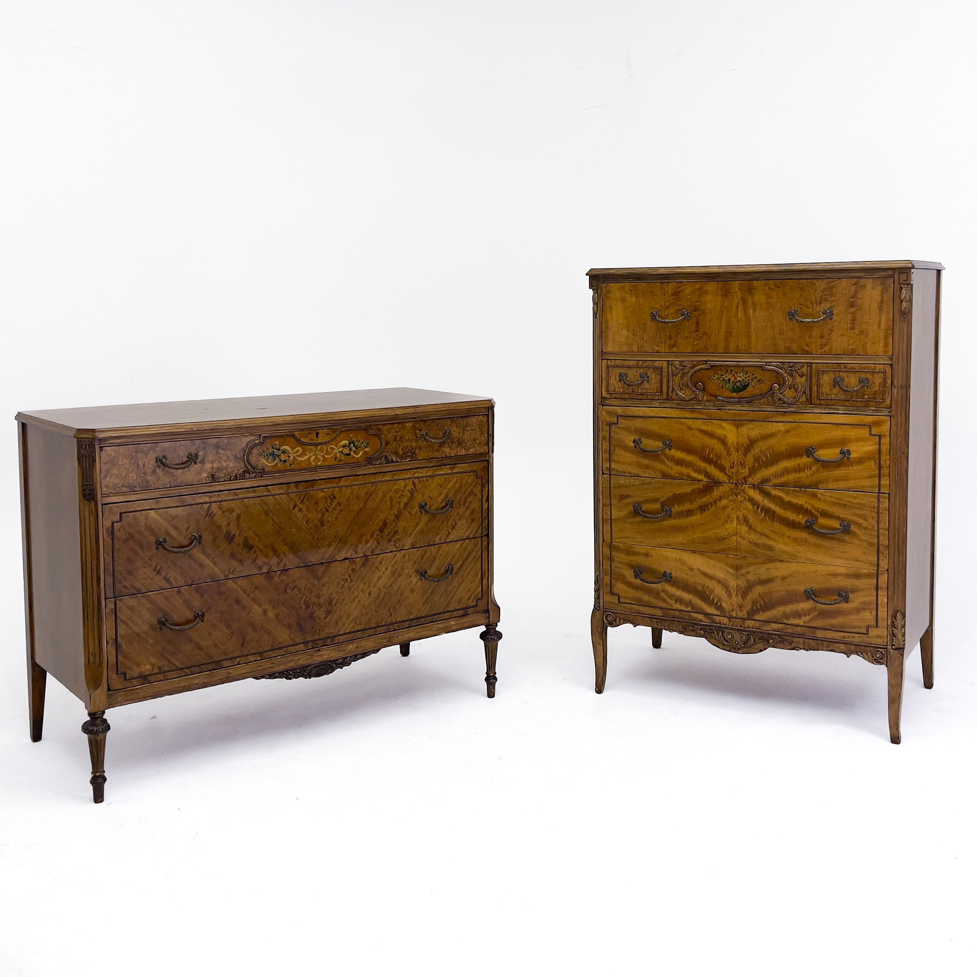 Two bedroom chests, the tall cabinet with five drawers raised on cabriole legs, the low cabinet with three drawers raised on tapered fluted legs.