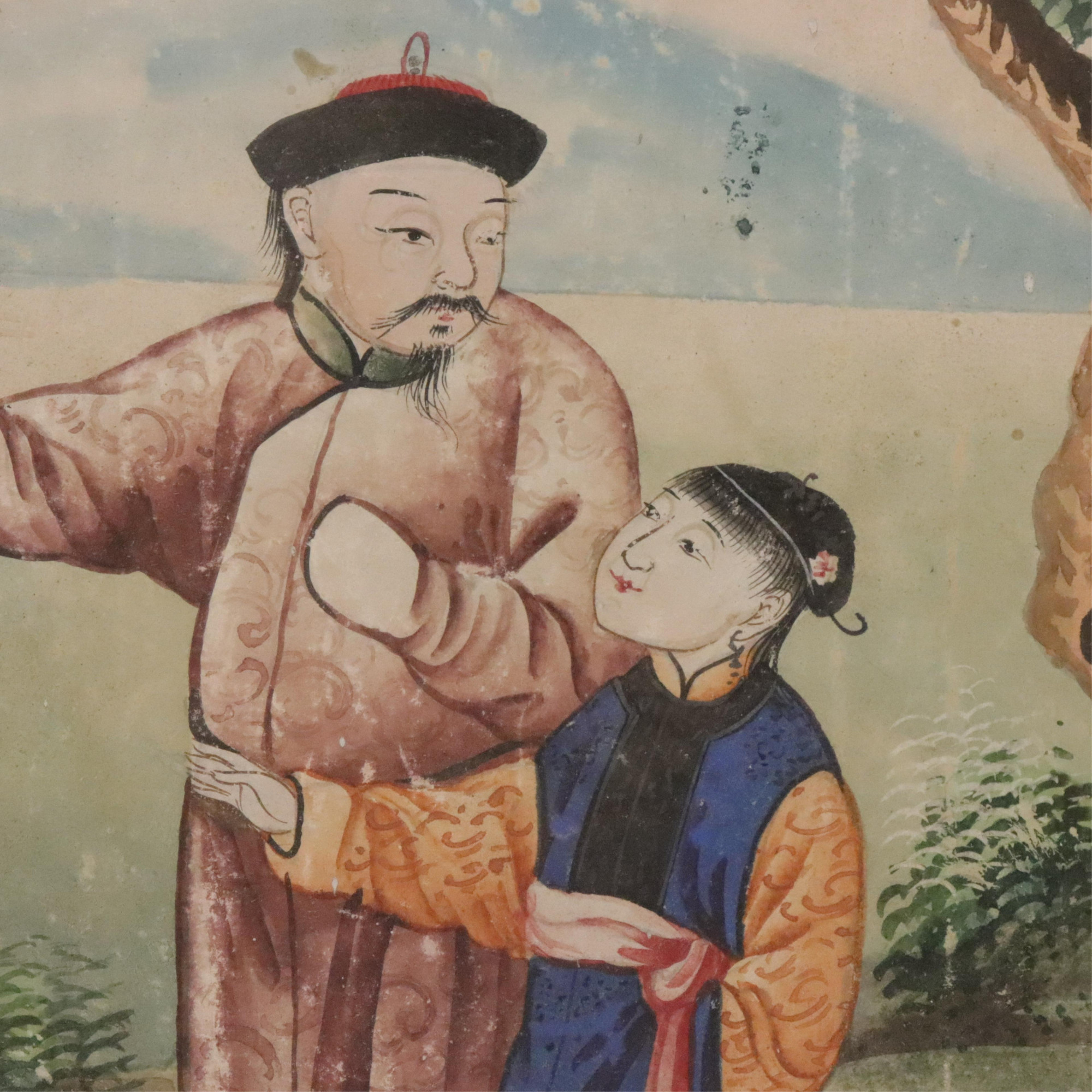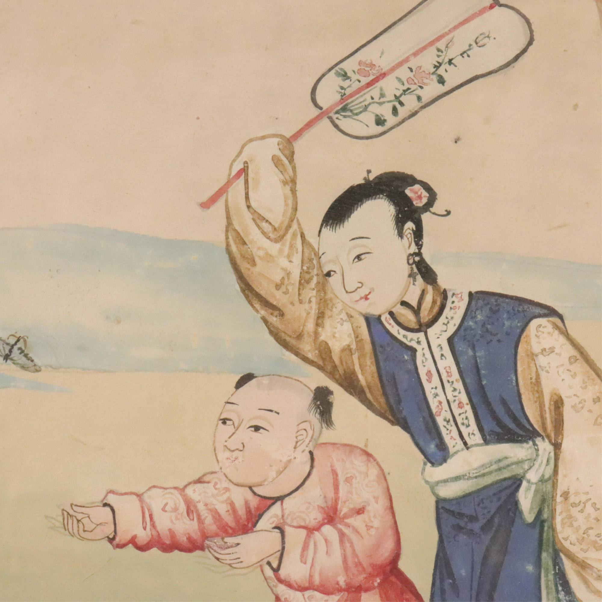 Pair Chinese Watercolor, 3 Figures and one with butterflies Dimensions: 14" x 11", Frames 23 1/4" x 18 1/2" Property from the Estate of Sara E. Vagliano (DVIA9386/2)(WT)