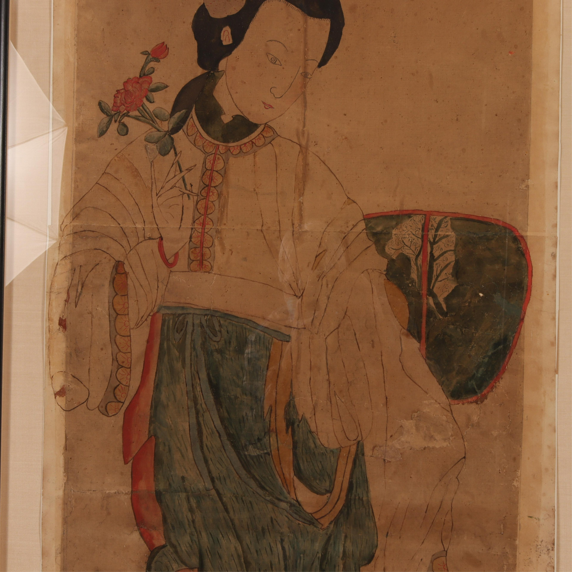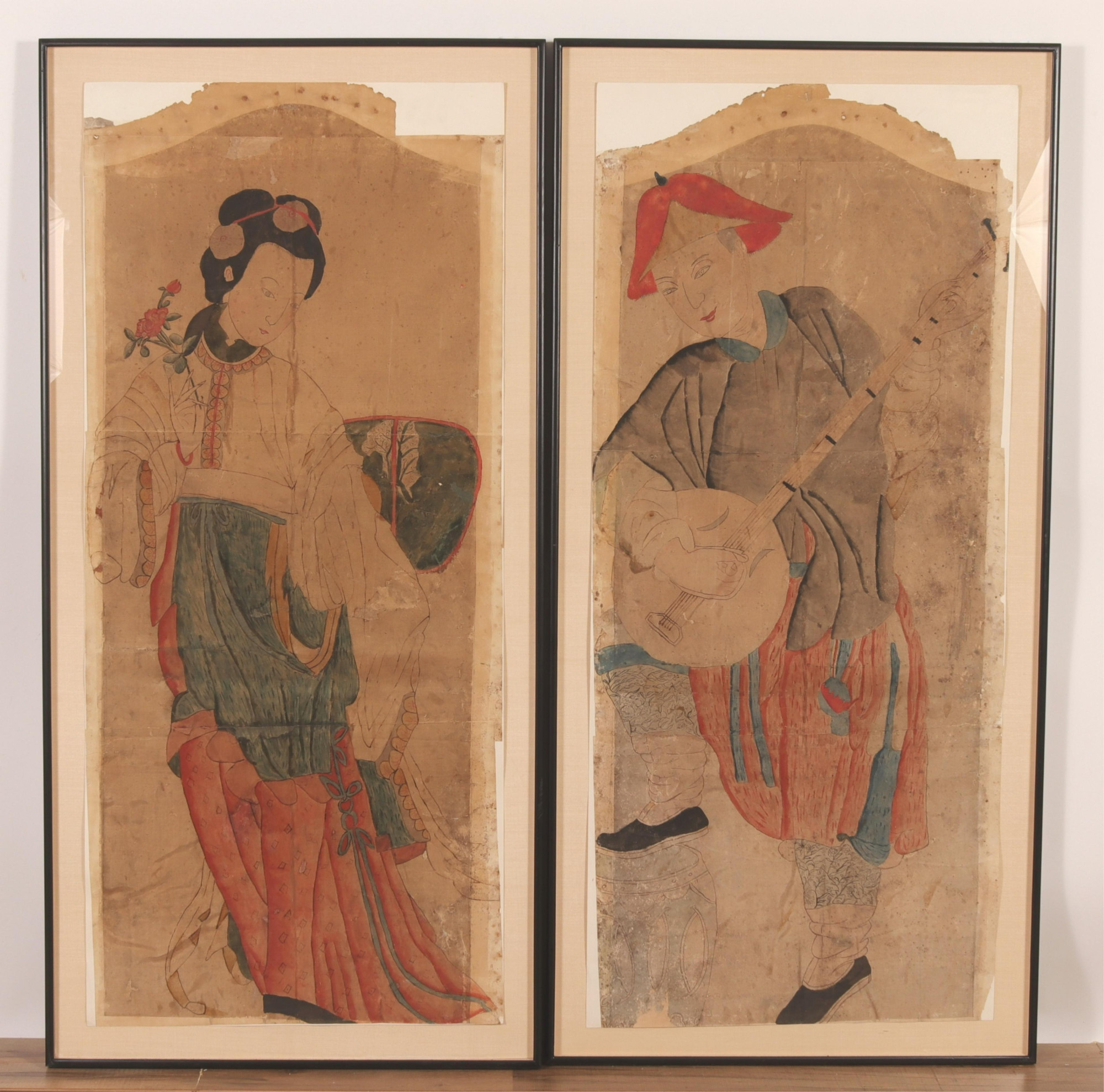 Pair of Chinese Watercolors, Male & Female Court Figures, laid on paper Dimensions::Sight 51" H x 22 1/2" W, Framed 57" H x 27 1/2" W Property from the Estate of an Important New York Modernism Dealer.