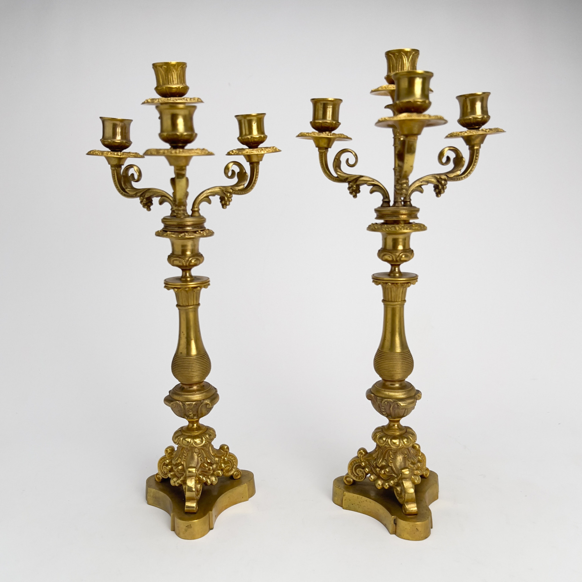 Well chased French gilt bronze candelabra pair, two-piece design with four lights each.