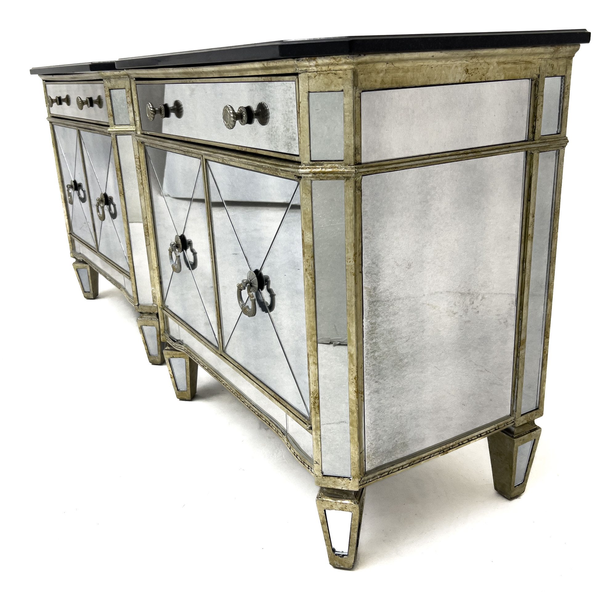 Pair of nightstands, each having mirrored panels, two cabinet doors, one drawer, and a black granite top.