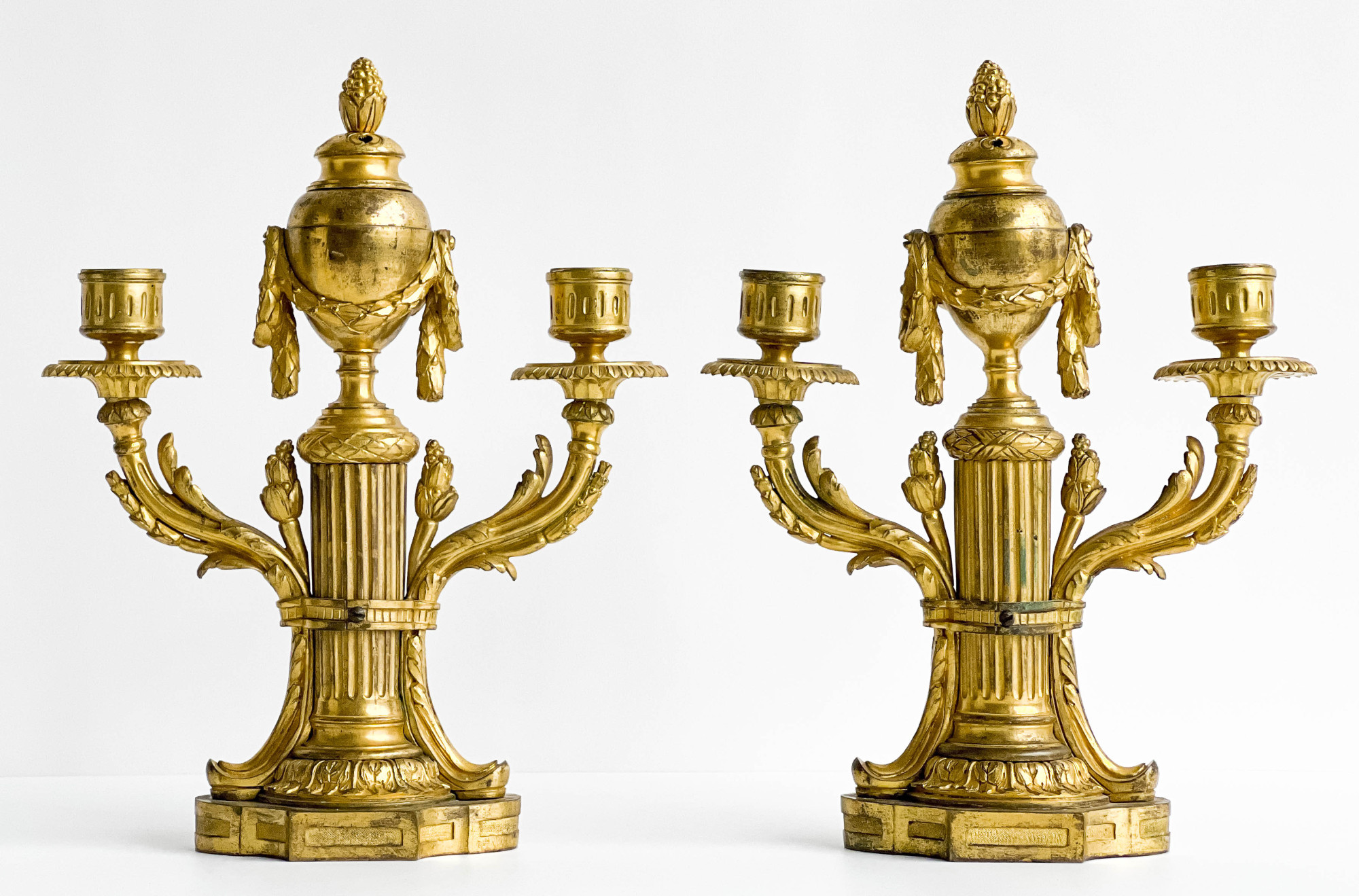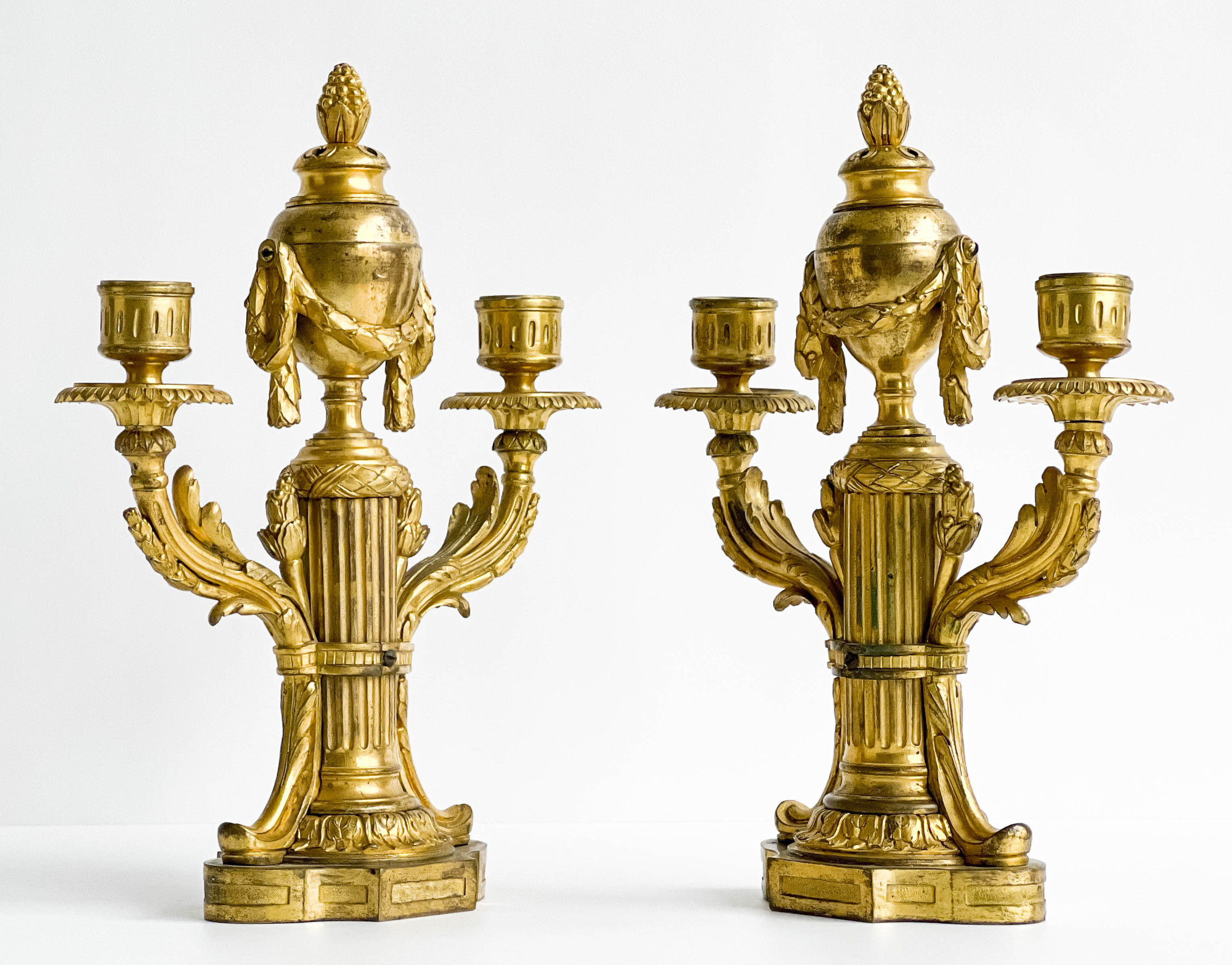 with two lights, the stem as a fluted column flanked by foliate-cast candlearms, topped by a cassolette with berried laurel swag and surmounted by a berry finial