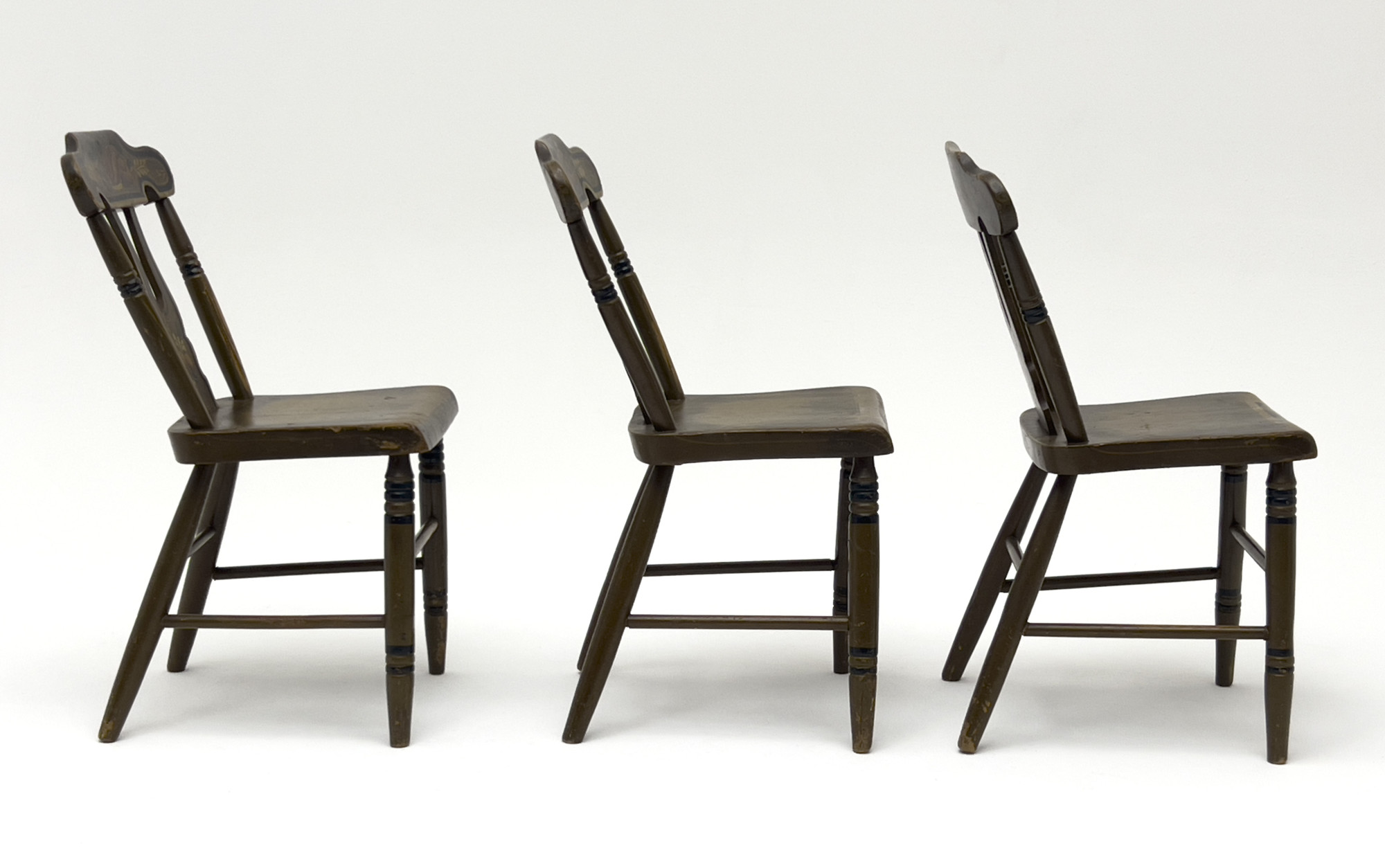 floral hand painted crest rails and back-splats, with plank seats, raised on tapered legs joined by stretchers