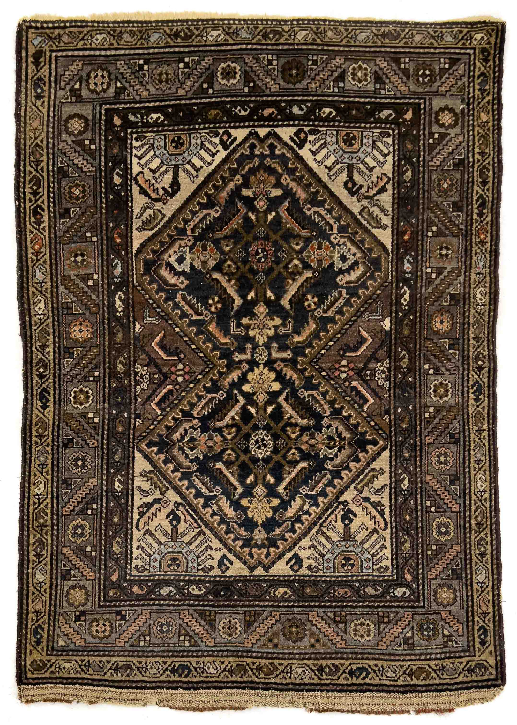 Hand knotted Persian rug with two large patterned diamond motifs in red, blue, and white on a predominately brown field