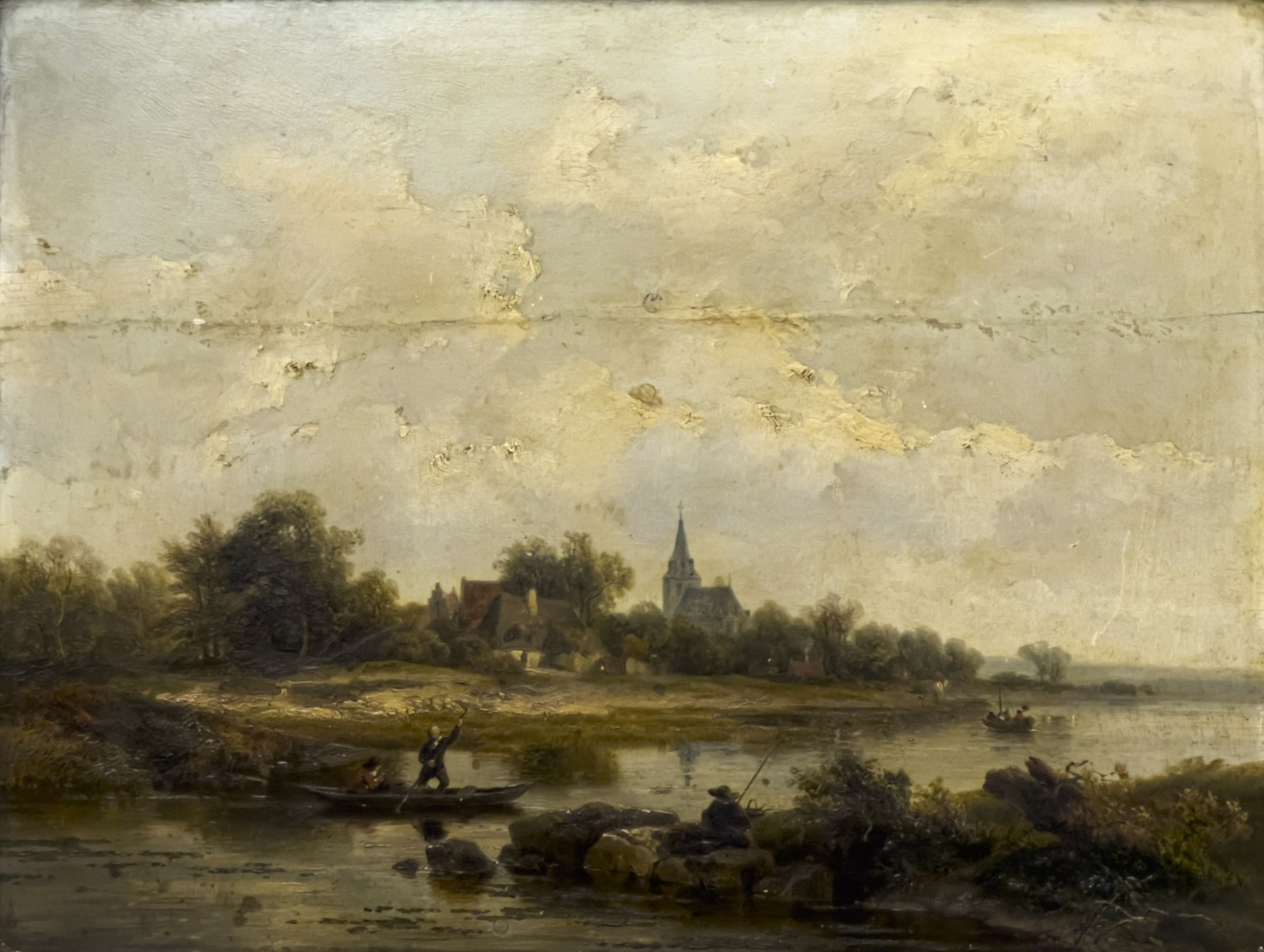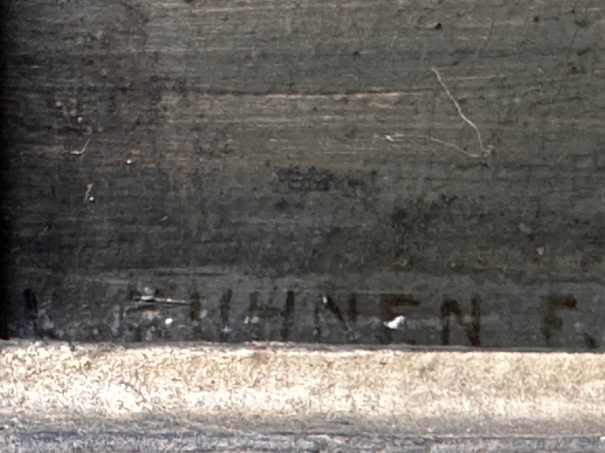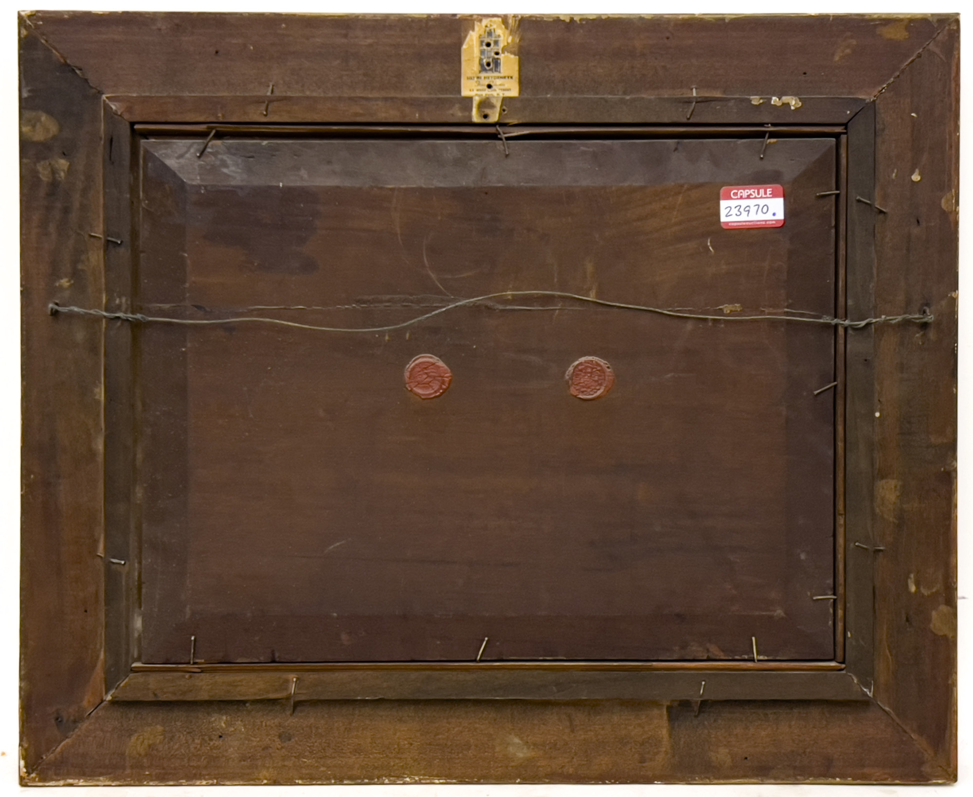 with some minor frame abrasions and craquelure, some minor scuffs, horizontal crack where board split, would benefit from a cleaning, a few areas have been cleaned