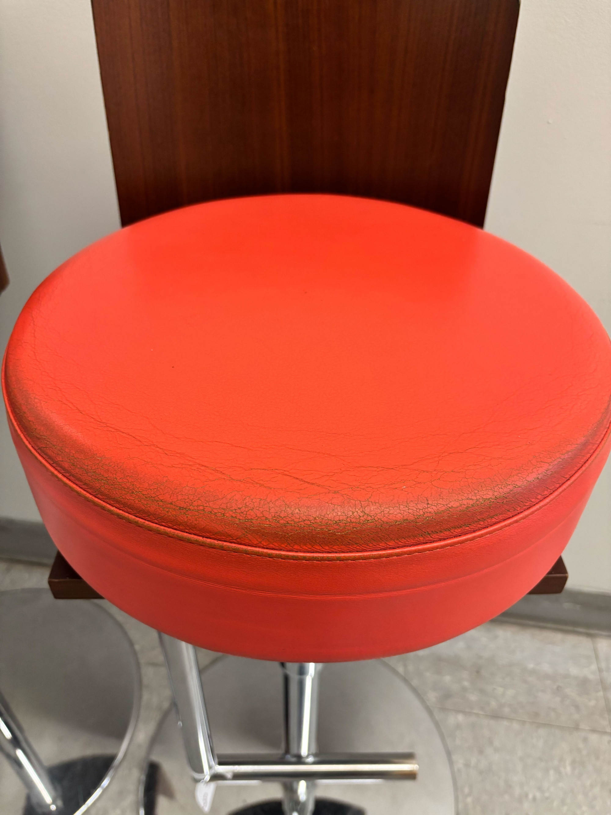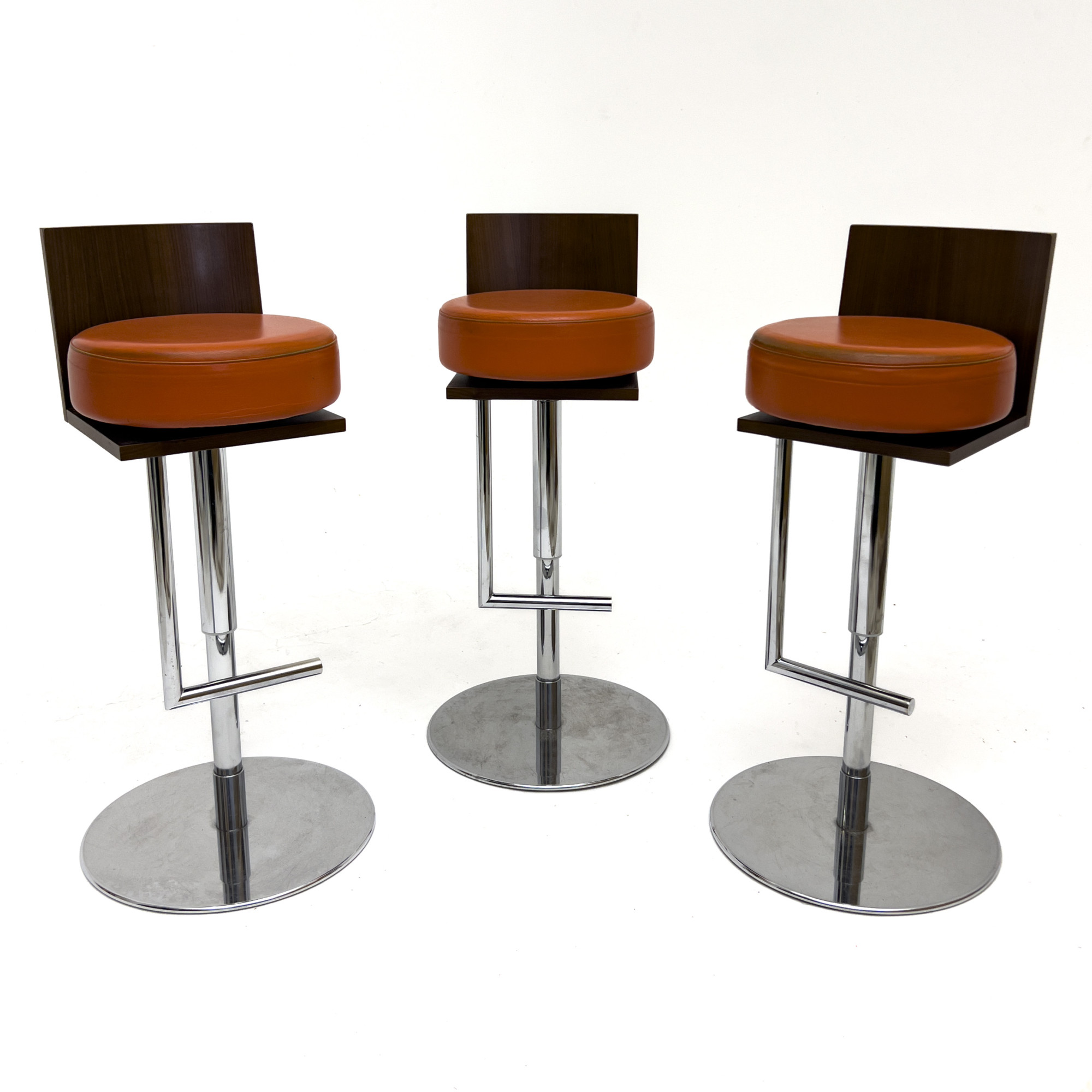 Comprising three bar stools designed by Claudio Silvestrin for Poltrona Frau, with walnut seats, orange leather cushions, and chrome bases with footrests