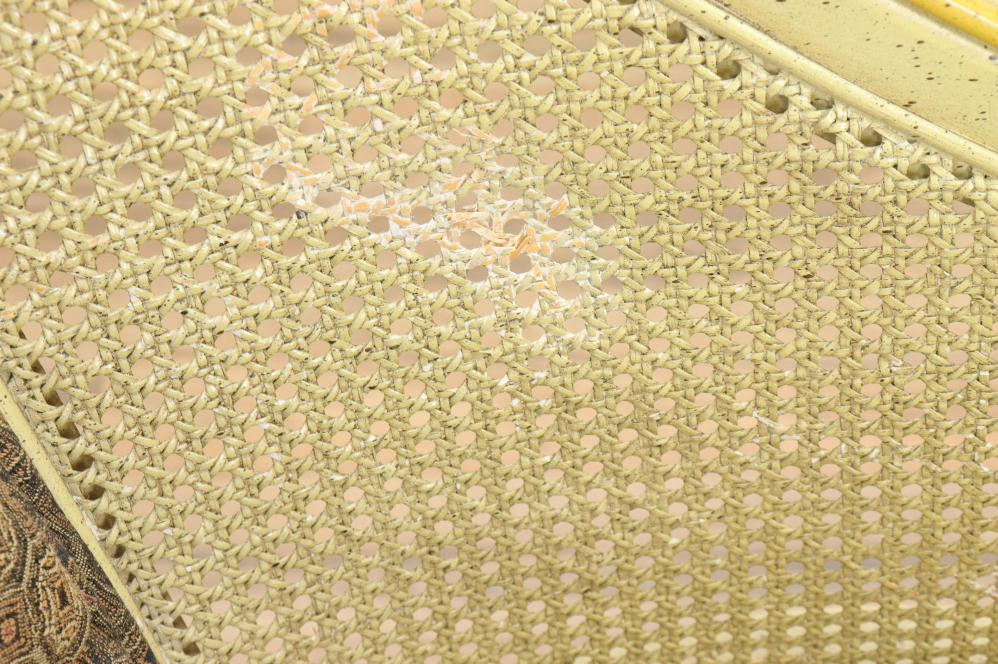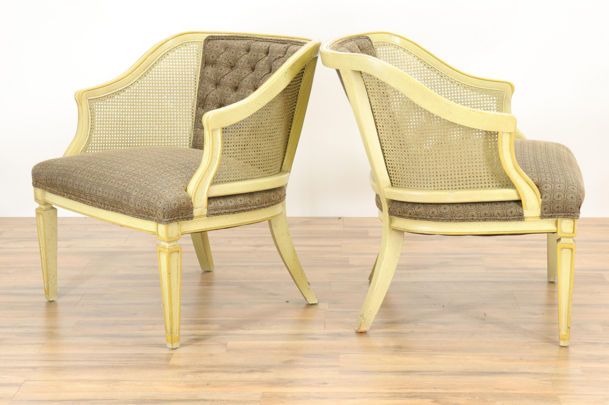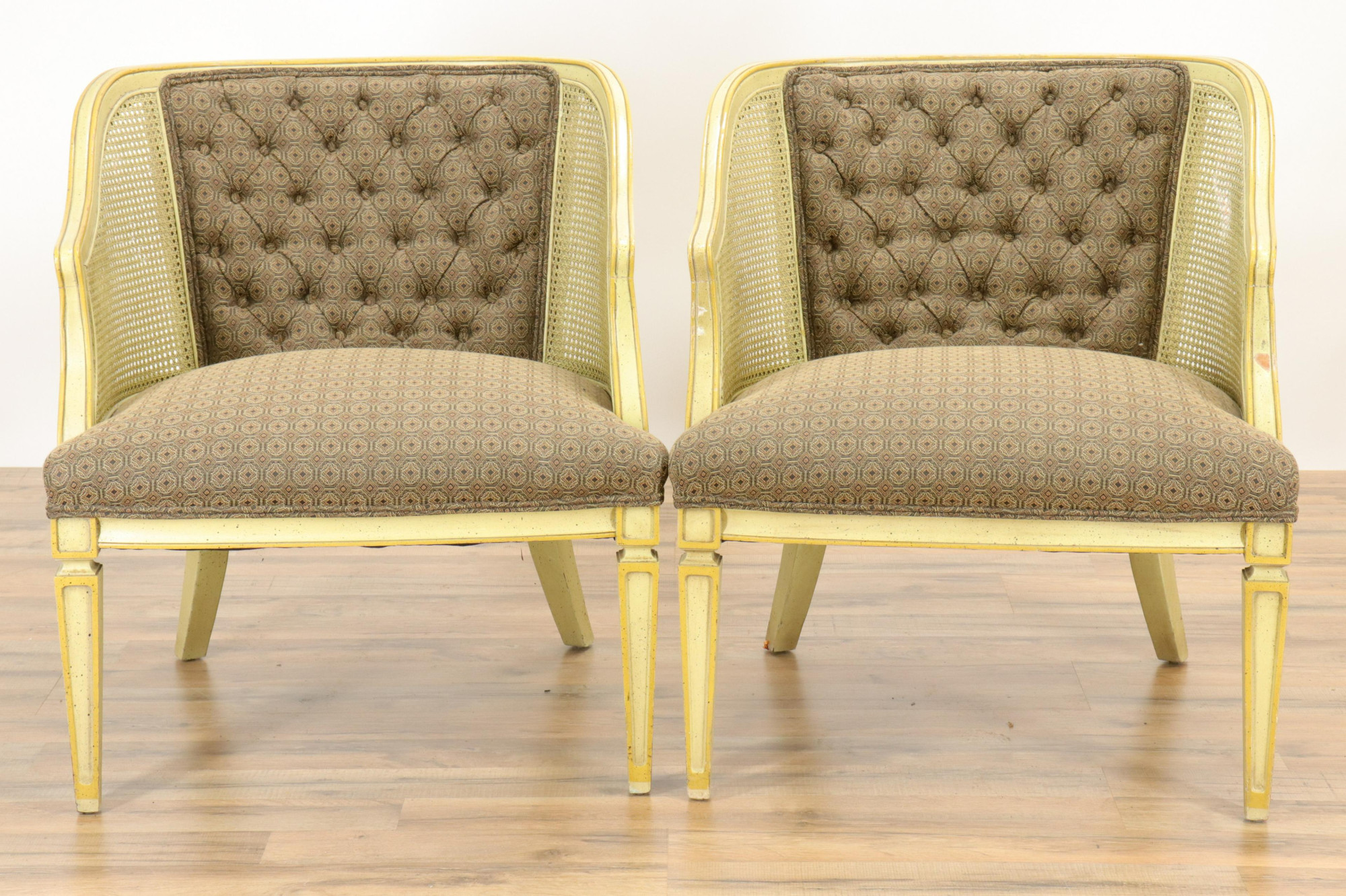 Pair of Louis XVI Style Vintage Midcentury Modern Wood Upholstered and Cane, newly upholstered with tufted back, paint finish in distressed green (MALM2420/2)(MM) Dimensions: 30 x 27 x 30 Property from a West Hartford, CT collection