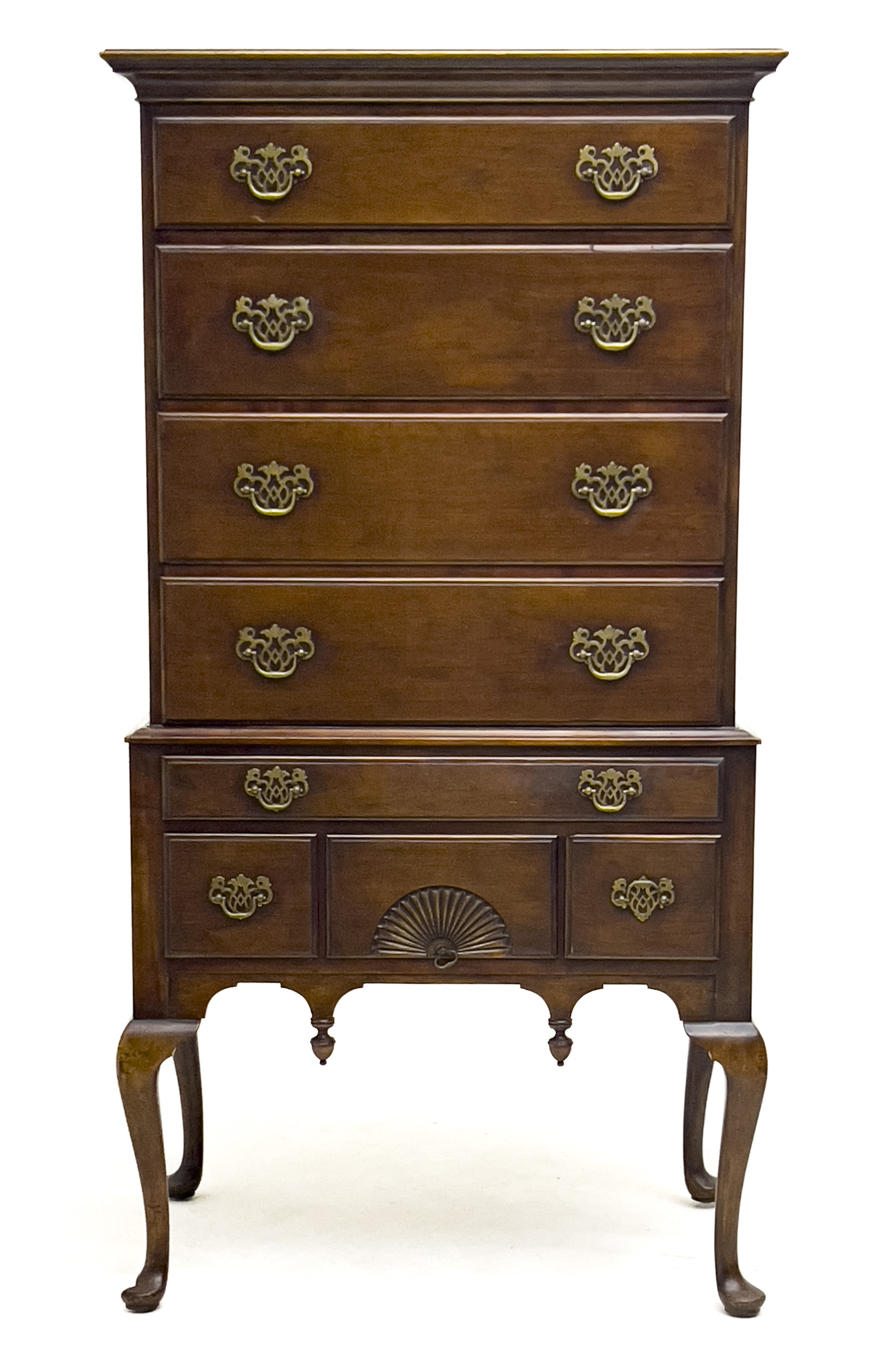 Set of four large drawers raised atop married base fitted with four smaller drawers, each with brass pulls, raised on four Queen Anne legs terminating in pad feet