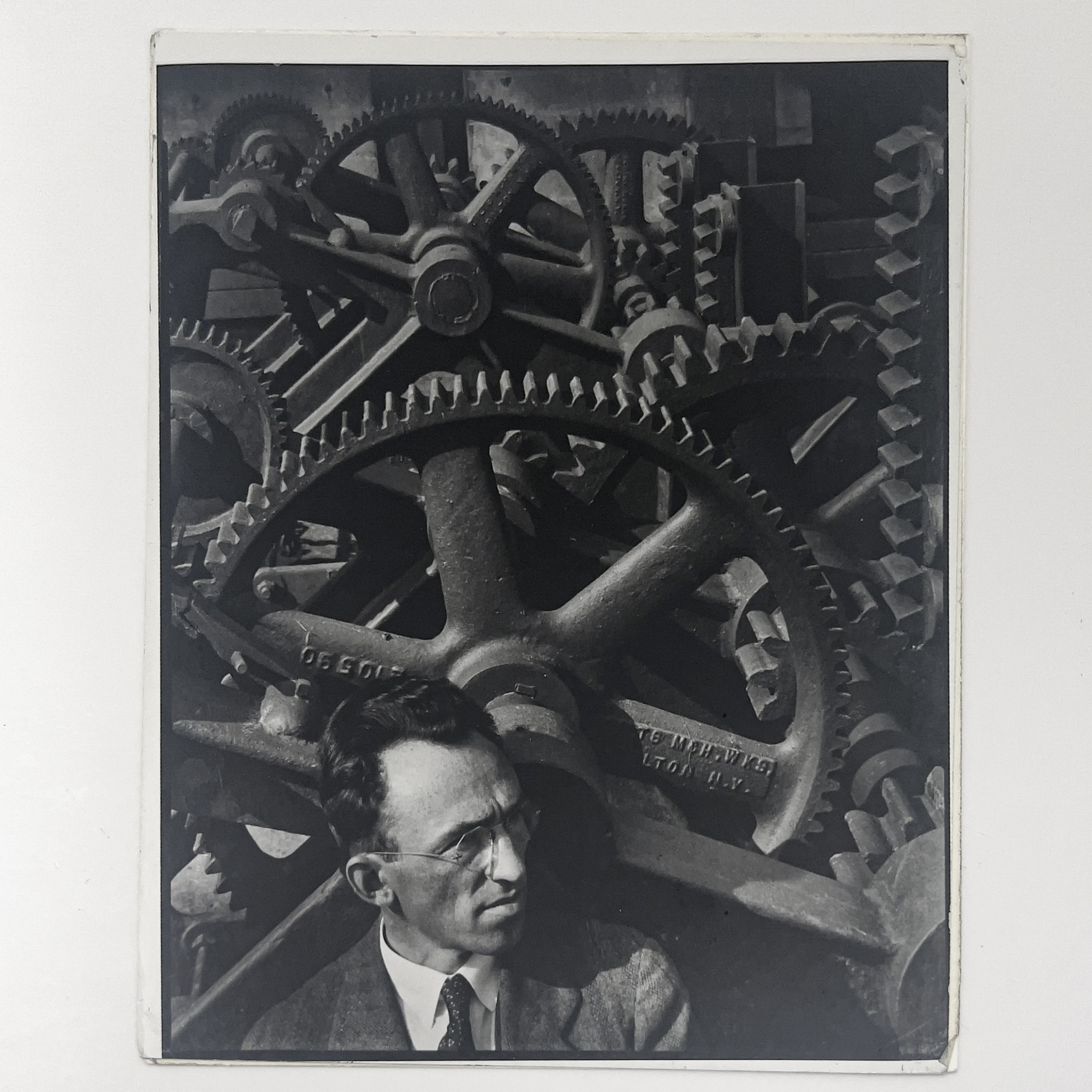 inscribed on back by the artist "Negative and Print 1929, only other early print purchased by Metropolitan Museum of Art - Subject is Louis Losowick, artist known quite well in the 20s and 30s for his industrial and skyscraper subjects - I photographed Losowick against the gearing of one of the locks od the Erie Canal - near Saratoga Springs, New York"