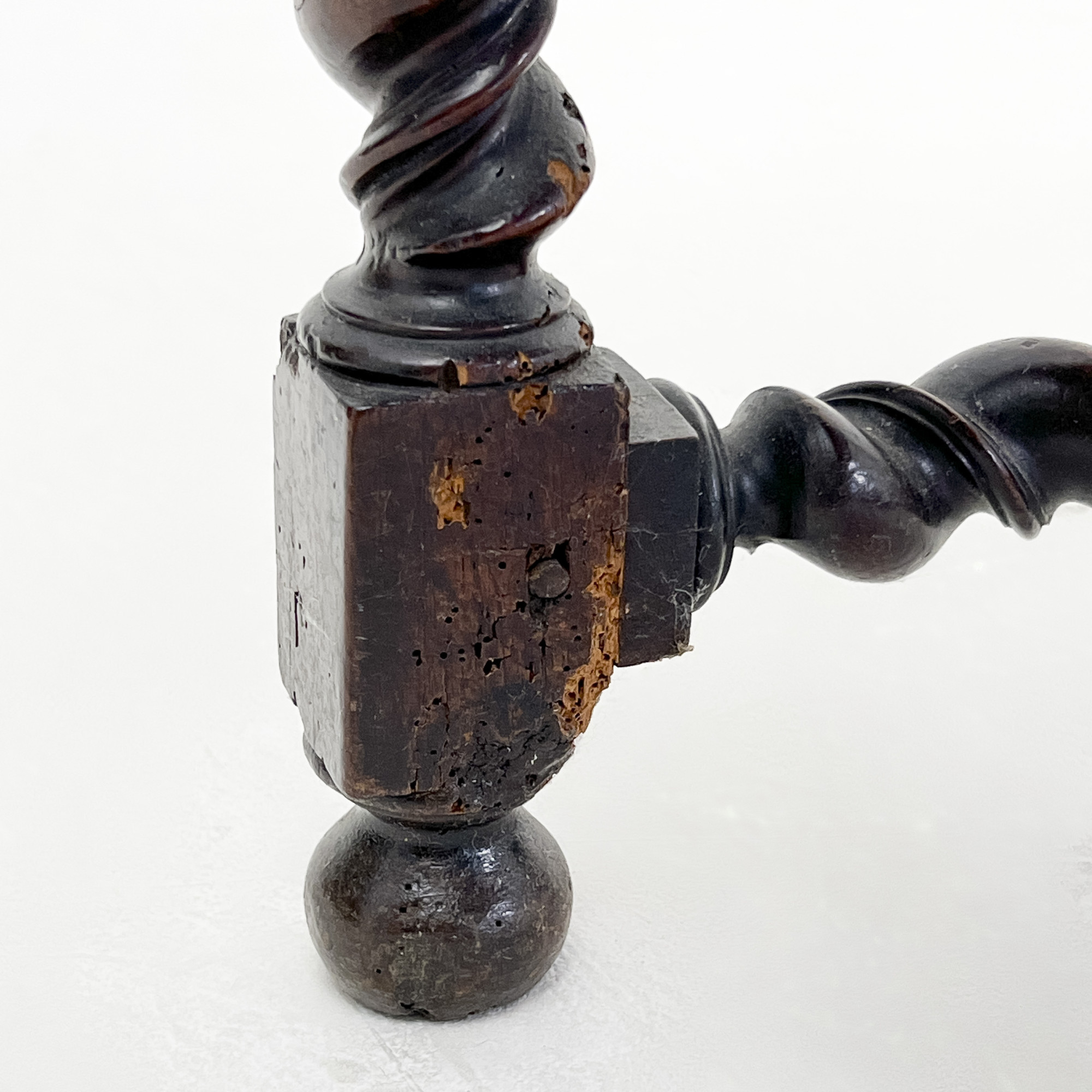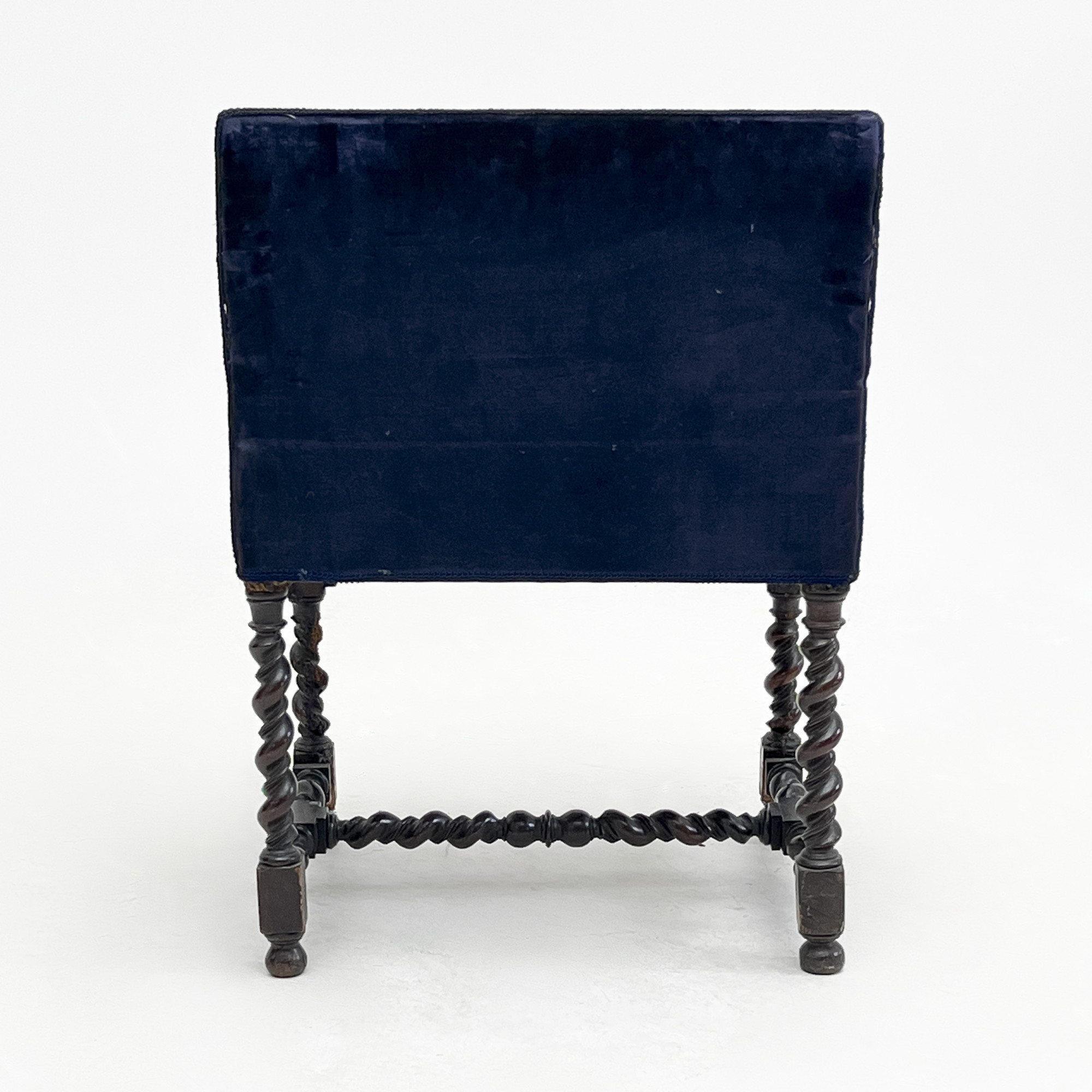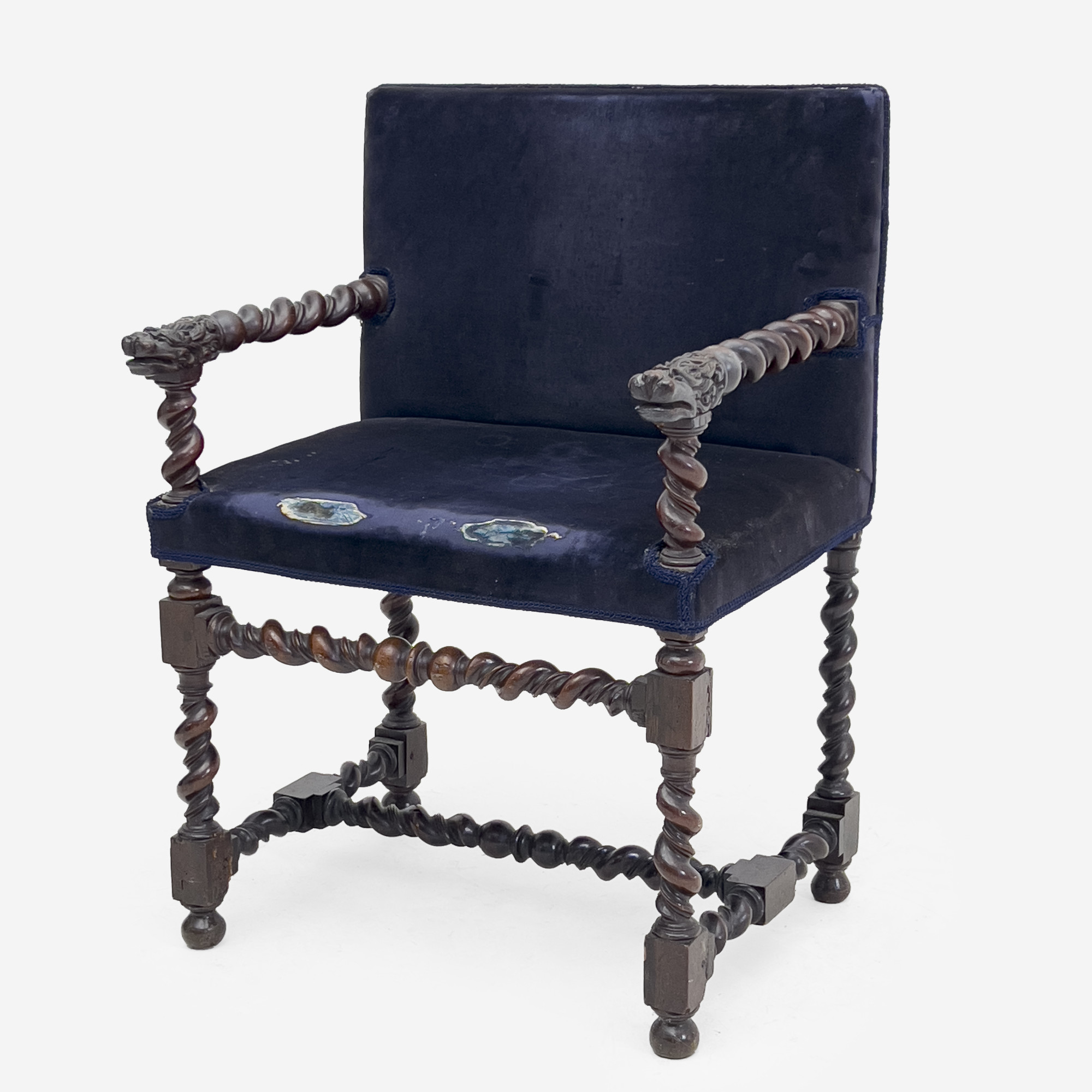 with velvet blue upholstered back and seat, twist-turned arms featuring lions heads, twist-turned legs and stretcher terminating in ball feet