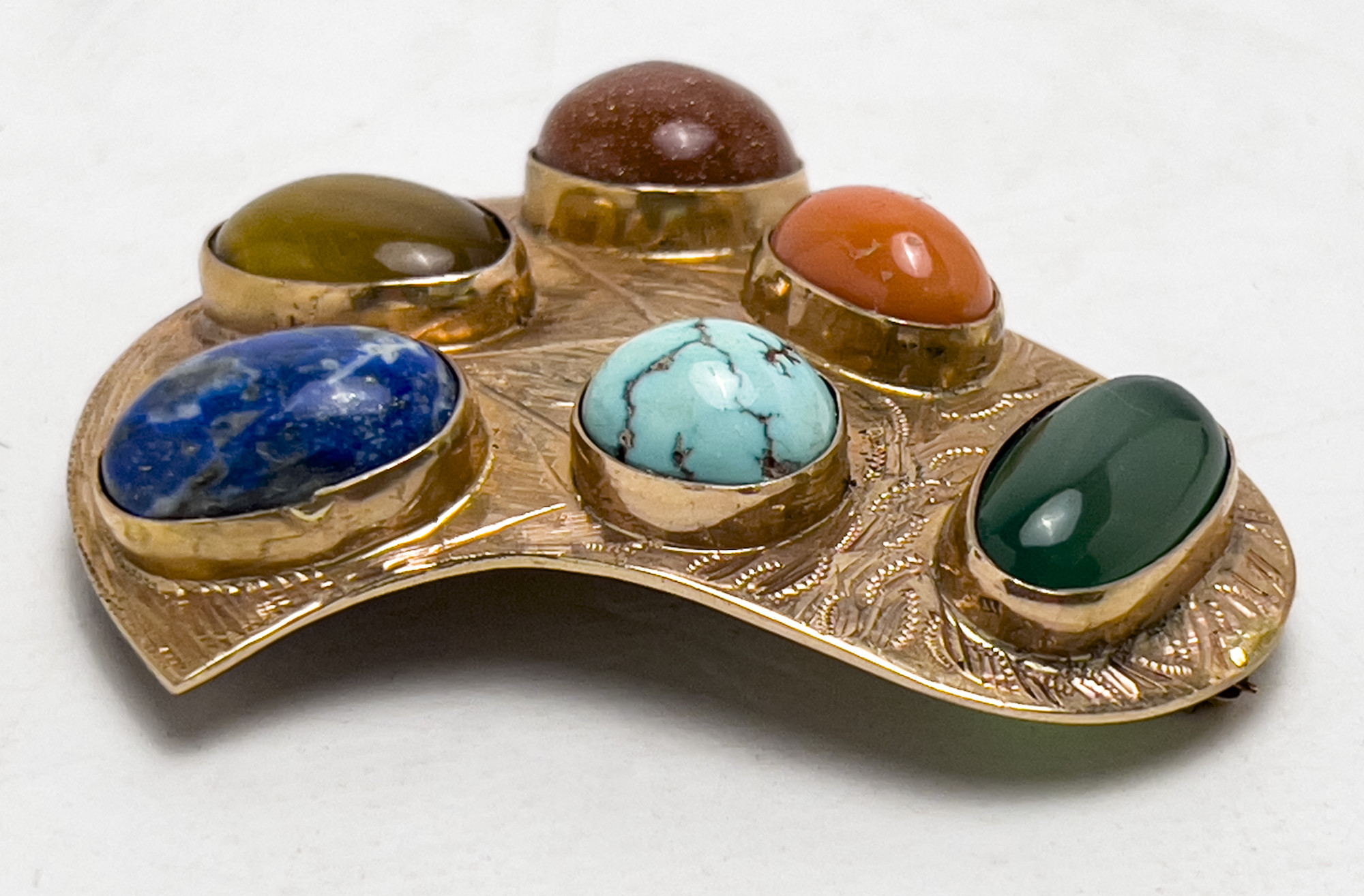 Brooch featureing a variety of stones, including tiger's eye, lapis, turquoise, goldstone, coral, and chrysoprase set into 14K rose gold