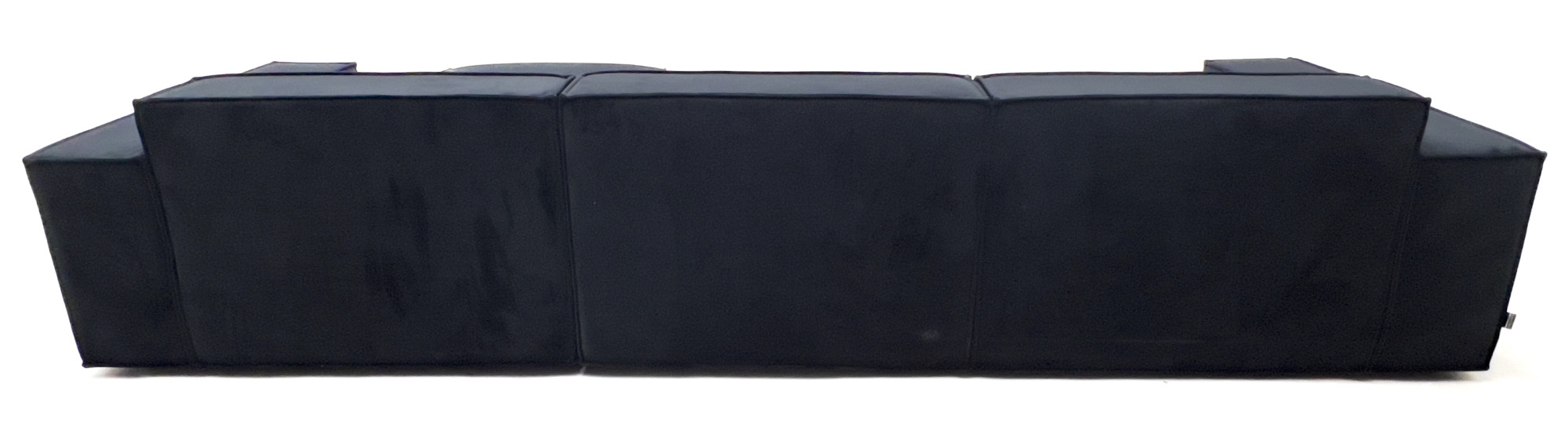 Modular sectional sofa, comprised of two parts (seat sofa and chaise), upholstered in black velvet, with four pillows