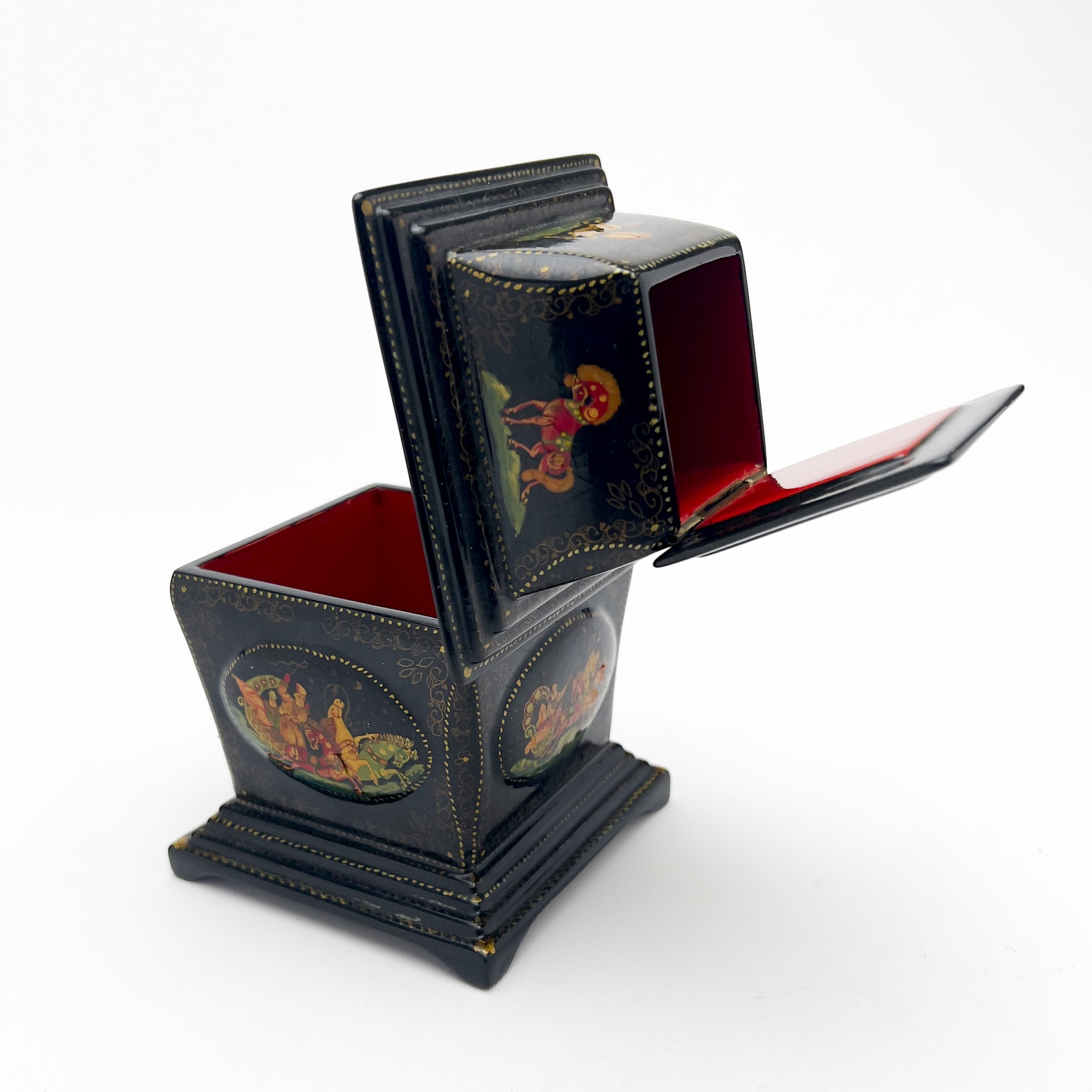 A two-tier papier-mâché Russian lacquer miniature box, paint decorated with two hinged compartments.