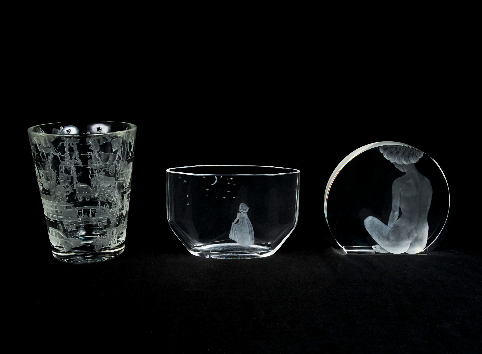Scandinavian Glass Makers - Orrefors Glass vase with 2 other Engraved Pieces