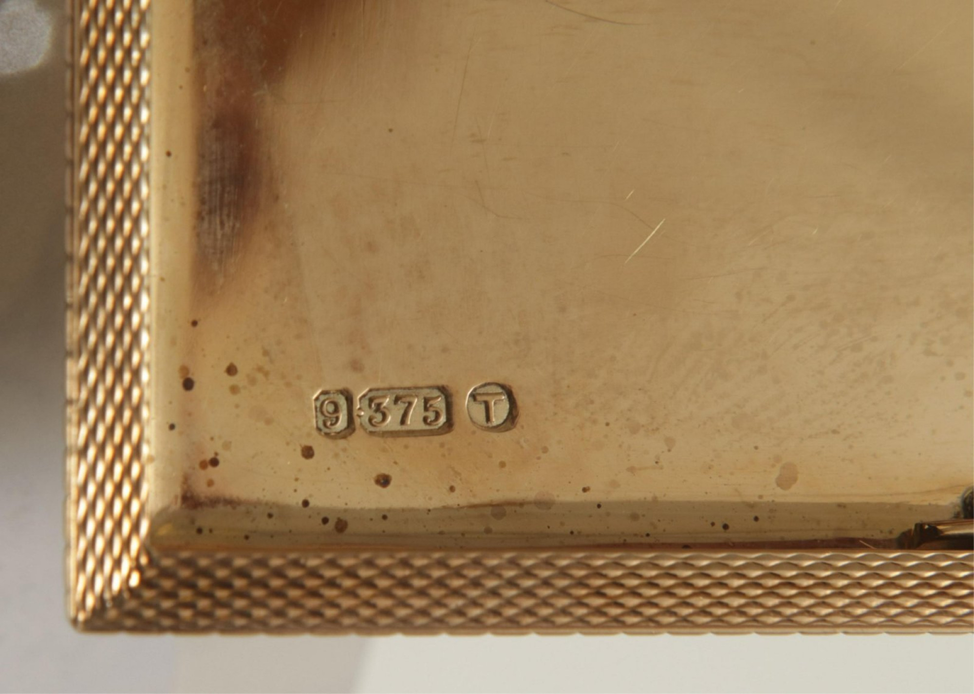Sheffield & Co 9K yellow gold art deco square texture compact. Interior top stamped KW / 9 / 375 / T / L / Made in England. Interior bottom stamped 9 / 375 / T / Sheffield & Co / Cairo. Spring hinge monogrammed HILL. 156.4 grams.