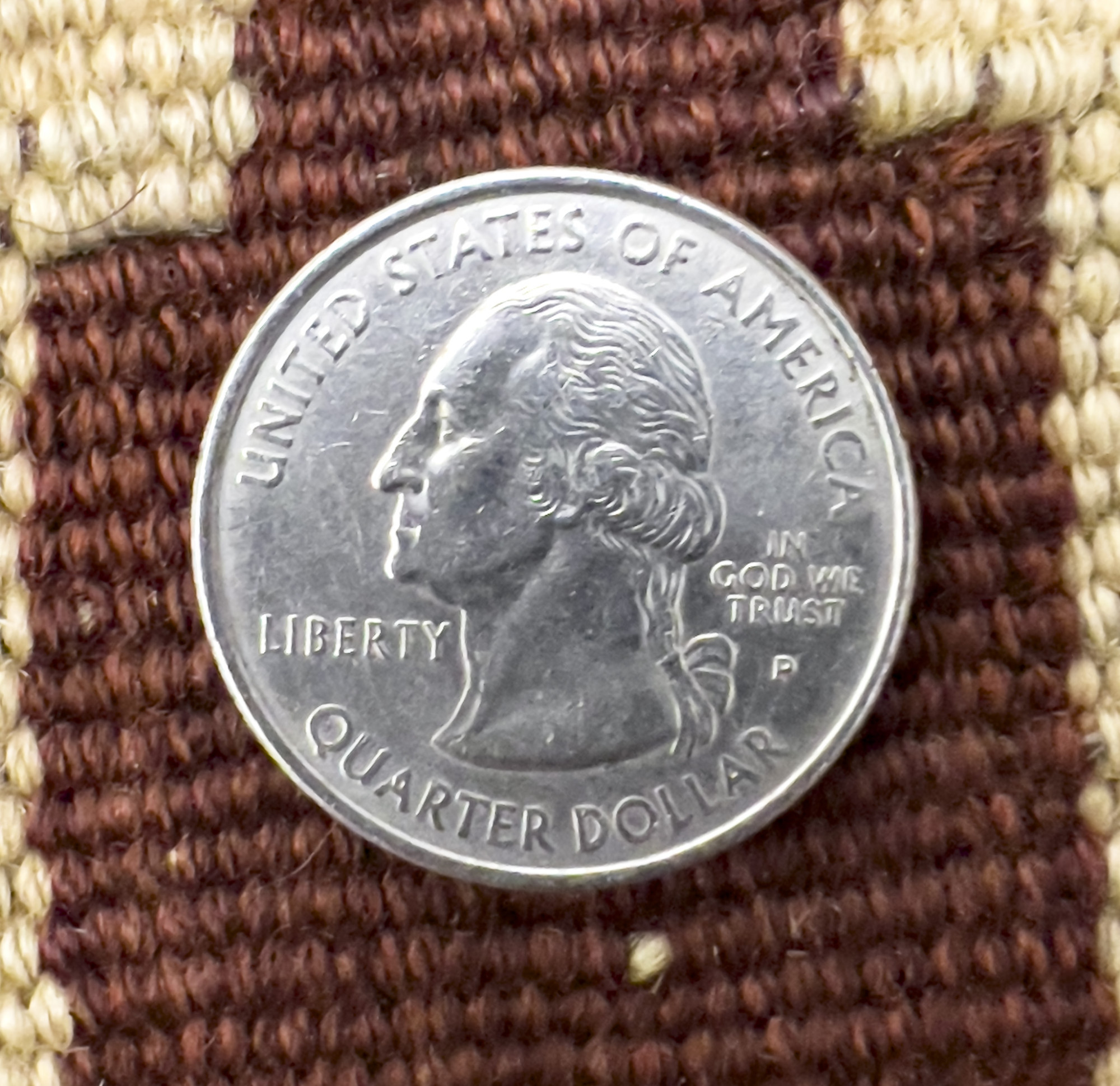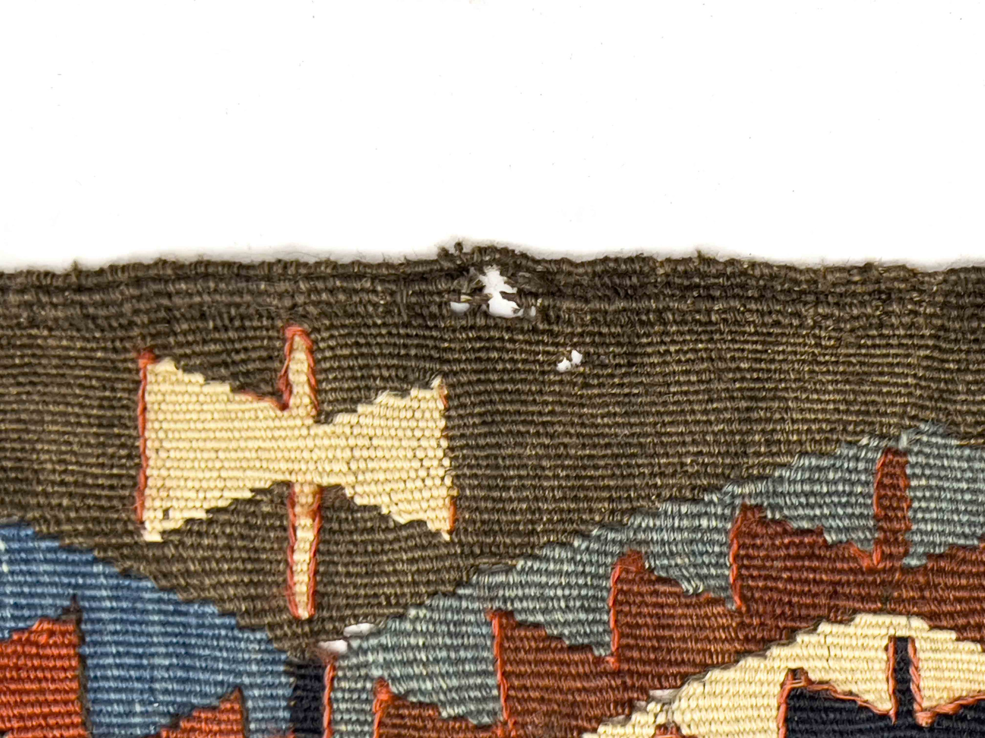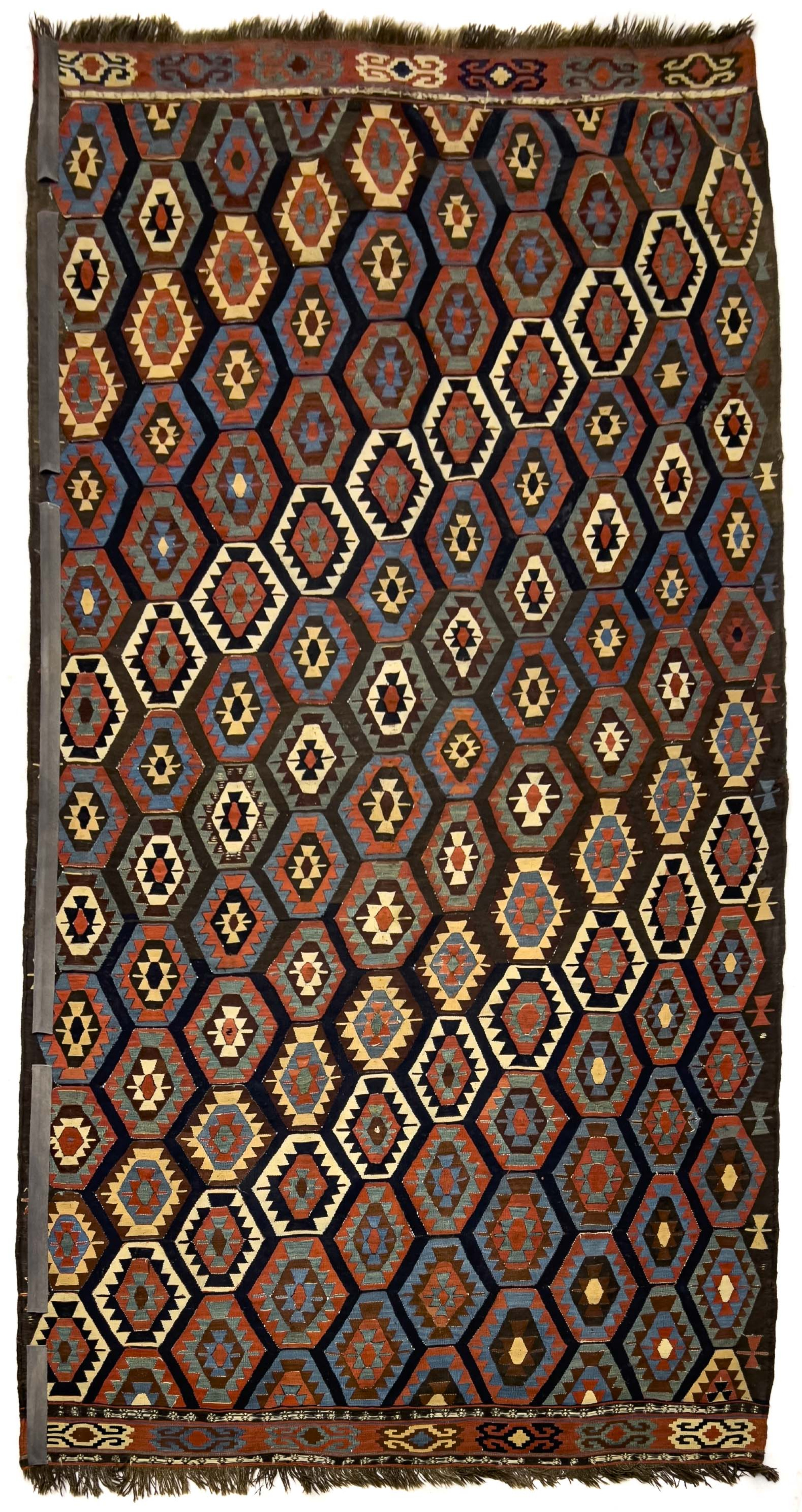 Hand knotted Shirvan Kliim rug with diagonal rows of stepped hexagonal medallions, and latchhook skirts at both ends, with starflower guard border, fitted as wall hanging