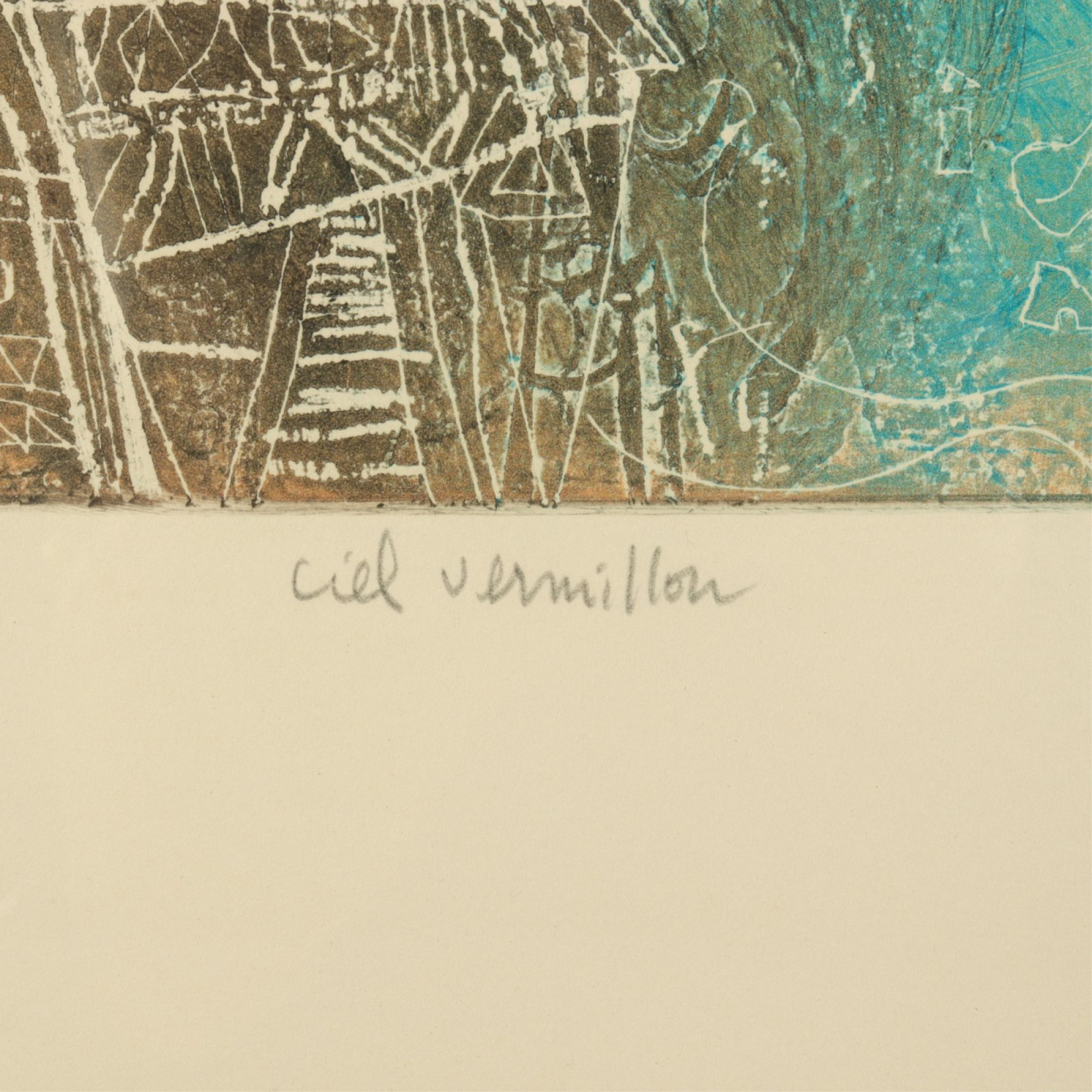 Titled "Ciel Vermillion". Signed, titled, edition numbered 113/160 along lower margin in graphite. Painted wood frame, linen mat over paper mat liner.