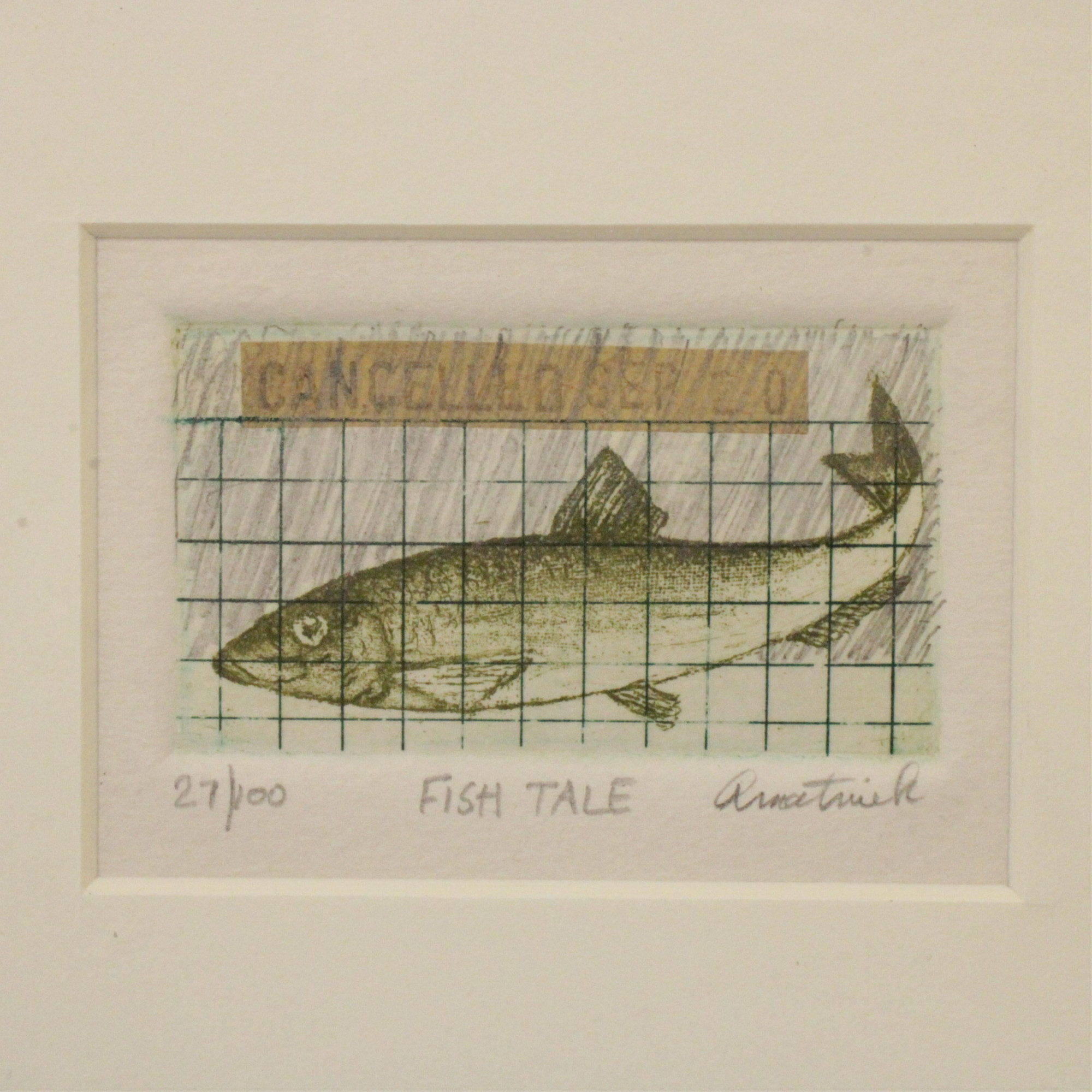 Fish Tale' embellished print, numbered, titled and signed illegibly in margin. Watercolor lake, unsigned; Morrison Gallery label verso.