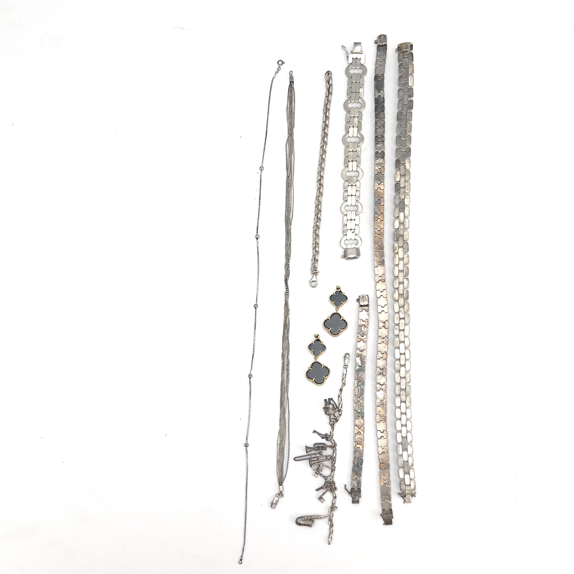 Sterling silver jewelry group, comprising of four necklaces, four bracelets (one with charms), and a pair of quatrefoil earrings for pierced ears. All pieces are stamped 925 or sterling except for the Rolo chain which is stamped .999