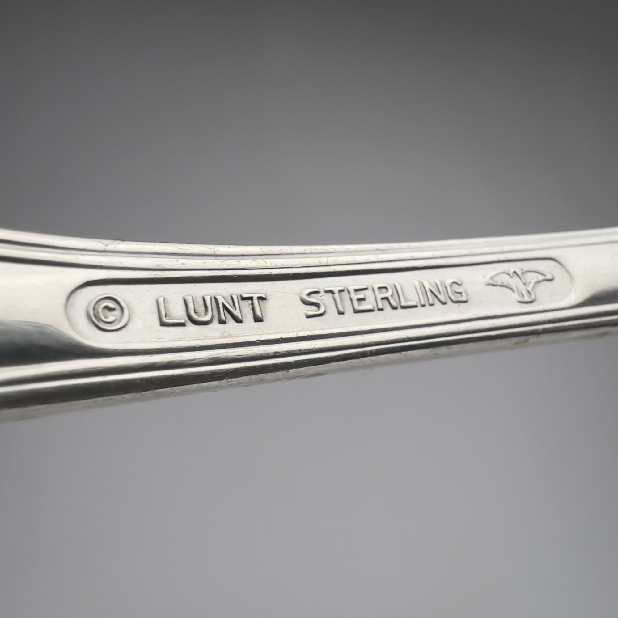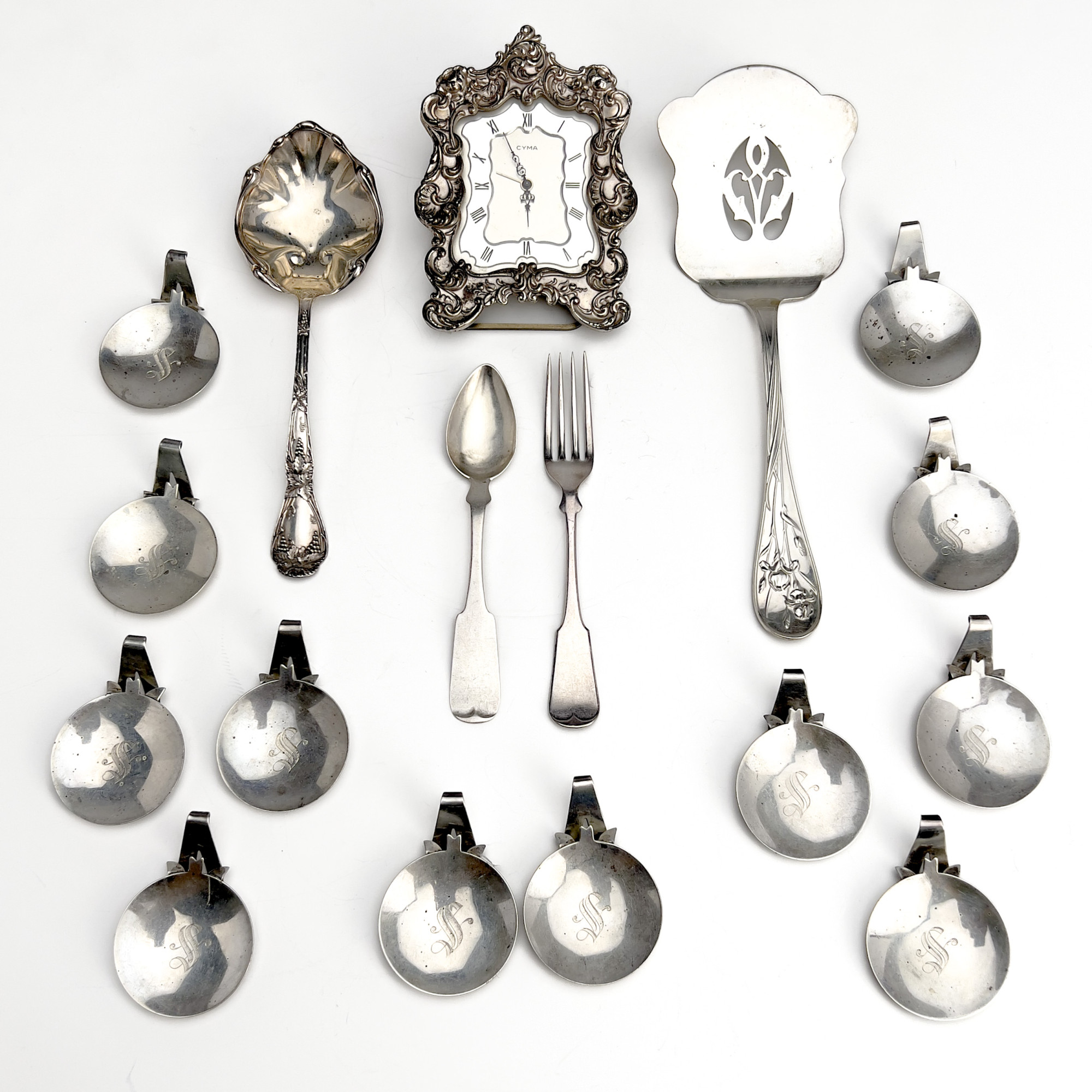 Sterling Silver group, including 12 Danish style placecard holders monogrammed "S", a grape motif serving spoon, a Lunt Quintessence asparagus server, and 19th century American silver (possibly 900) spoon and fork, as well as a CYMA travel alarm clock with baroque Gorham sterling frame