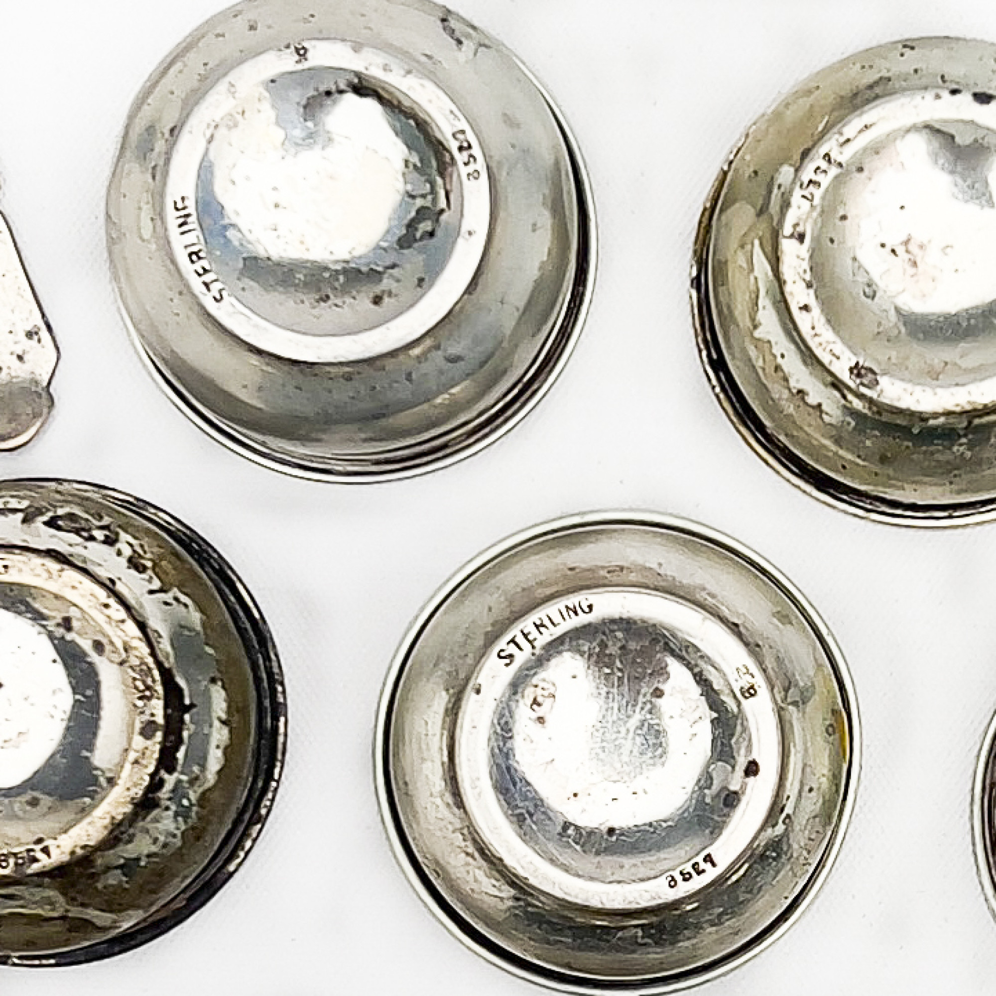 Salt cellar group, comprising of twelve small sterling salt cellars accompanied with twelve small sterling spoons