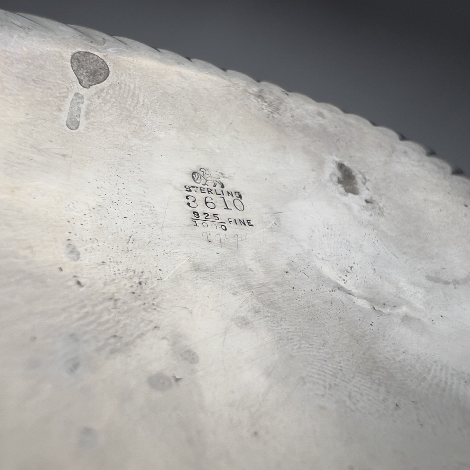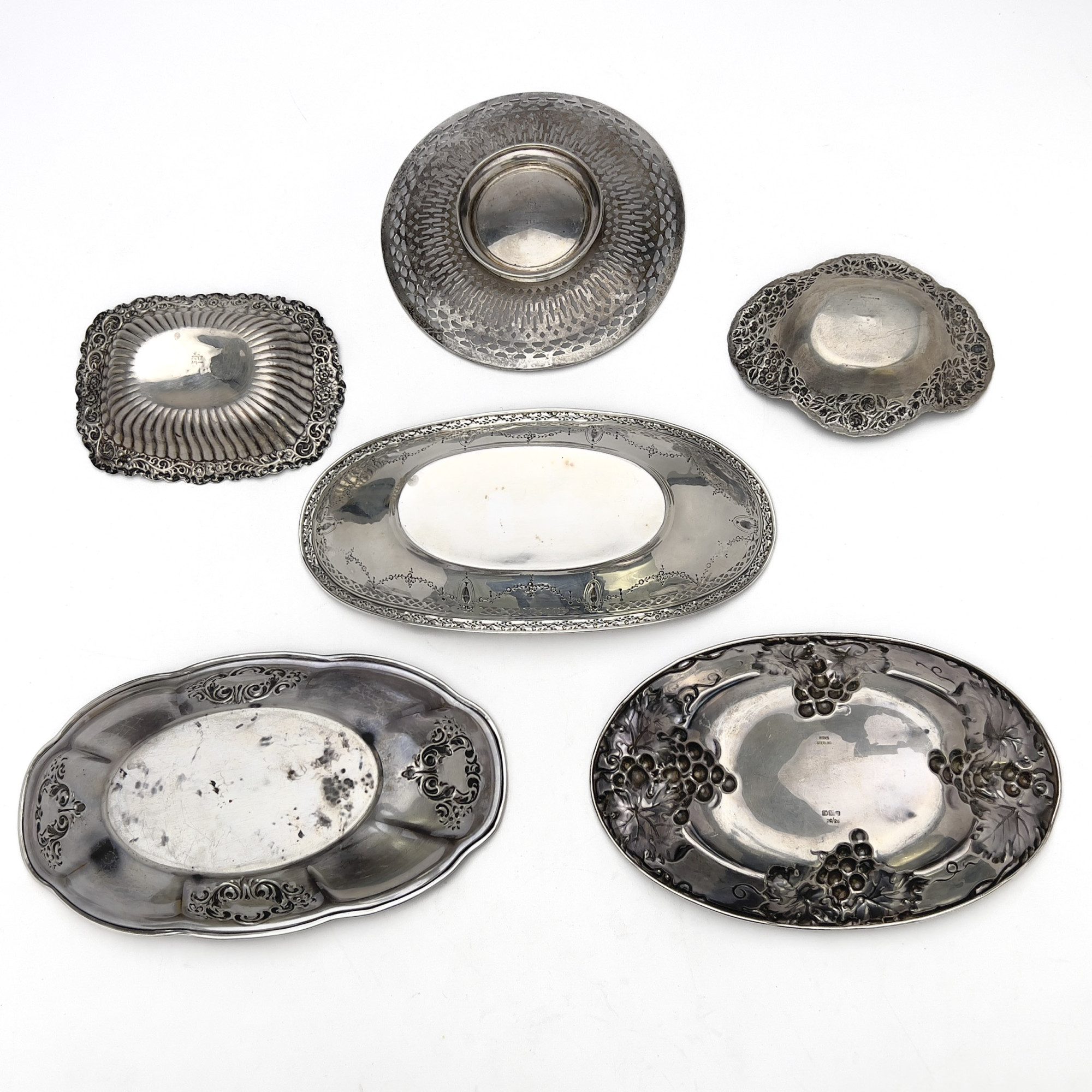 7 sterling silver dishes, 2 reticulated, 1 with monogram, including a Birks repoussé serving dish with a grape motif, all stamped