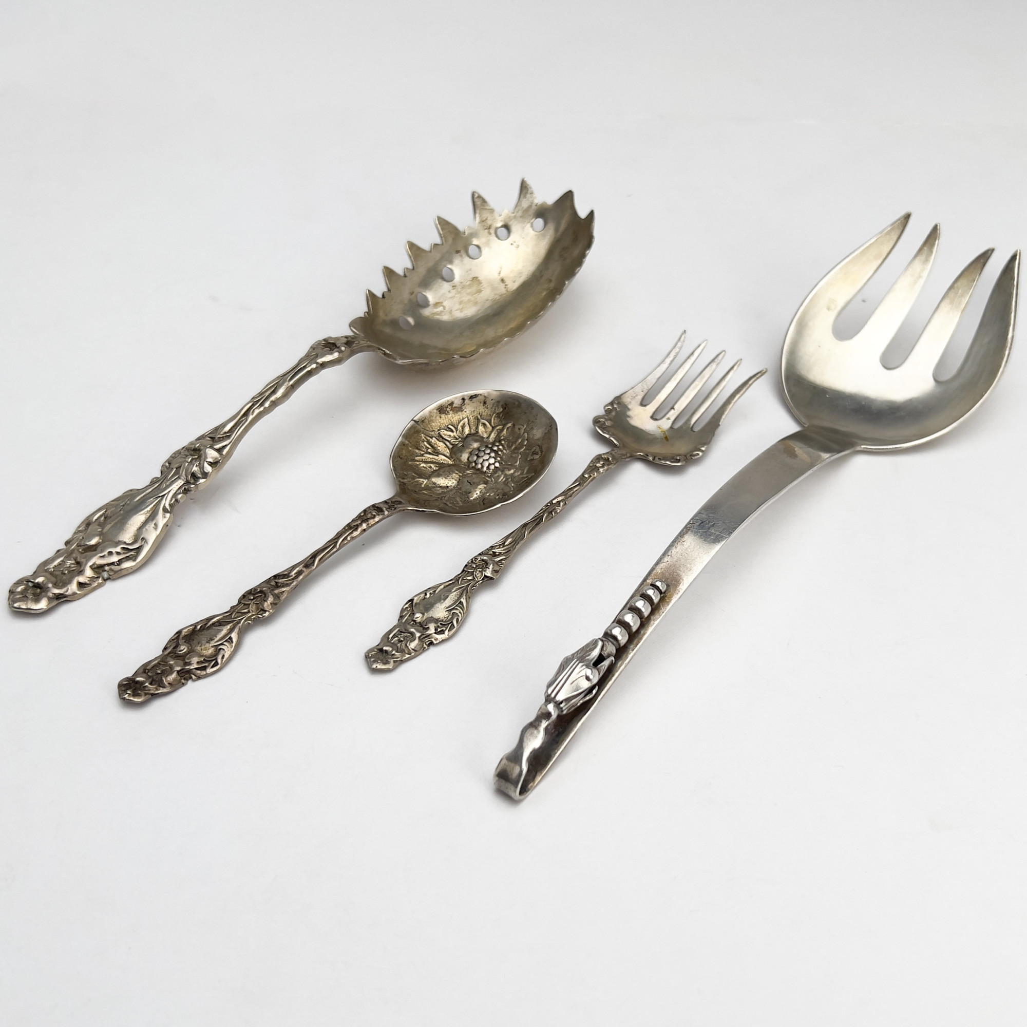 Sterling silver group, comprising of a large serving fork and spoon, and a smaller decorated fork and spoon