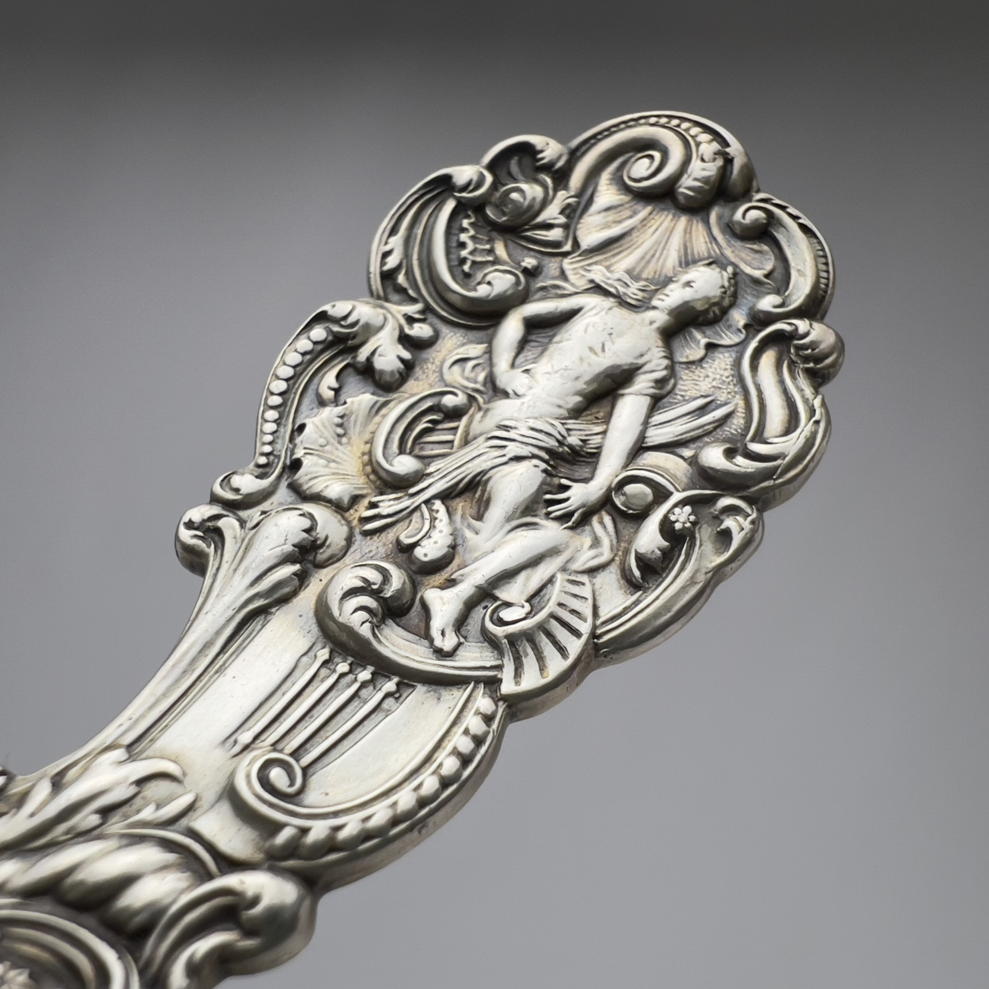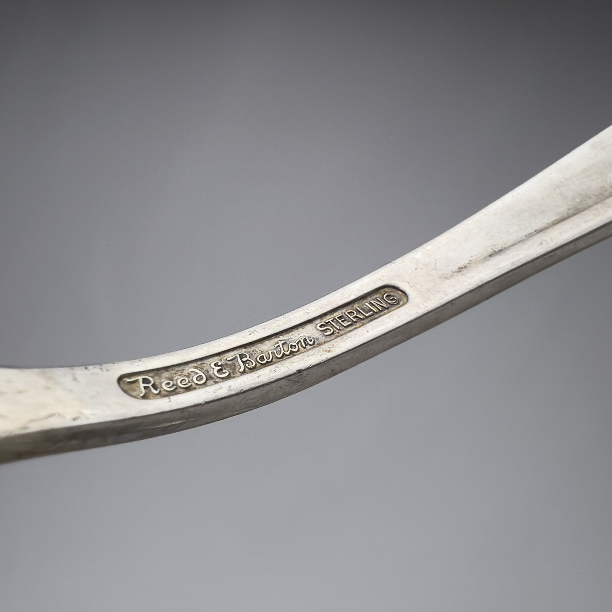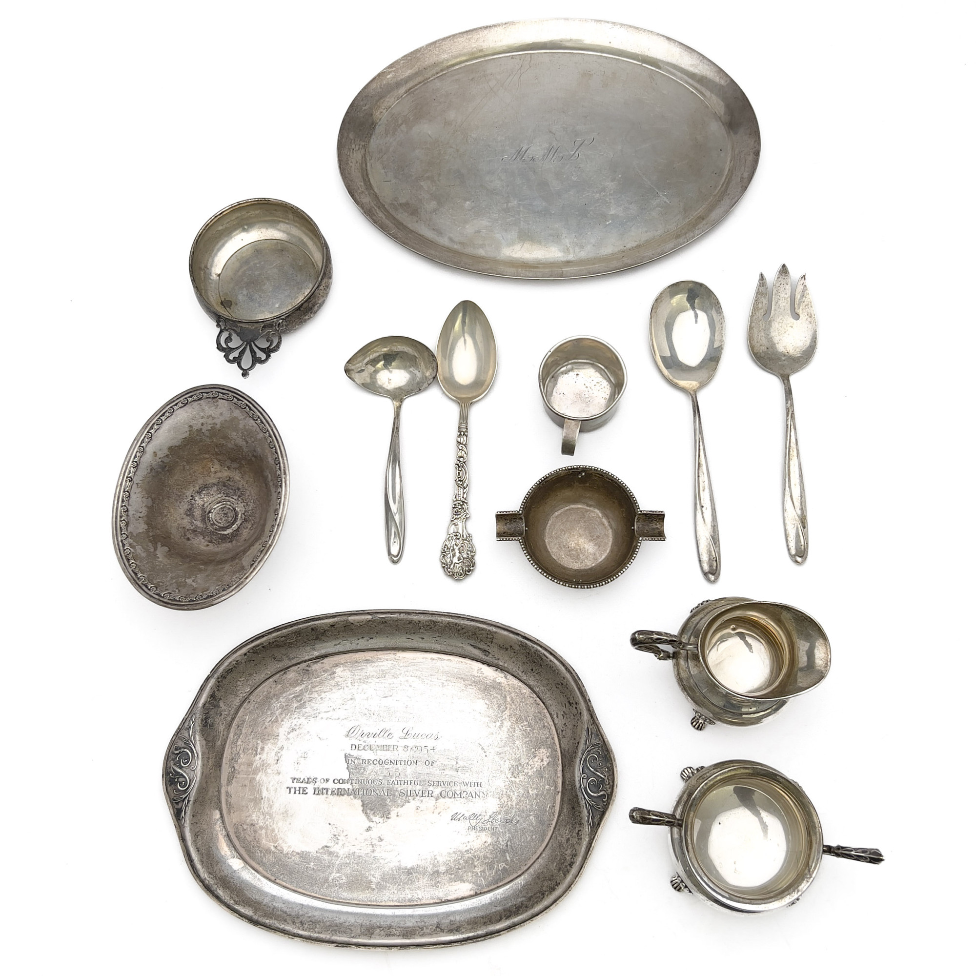12 piece sterling silver group includes Reed & Barton serving pieces, Fisher sugar bowl and cream jug, Caldwell ashtray, monogrammed tray, inscribed International Silver commemorative tray, and more, all stamped
