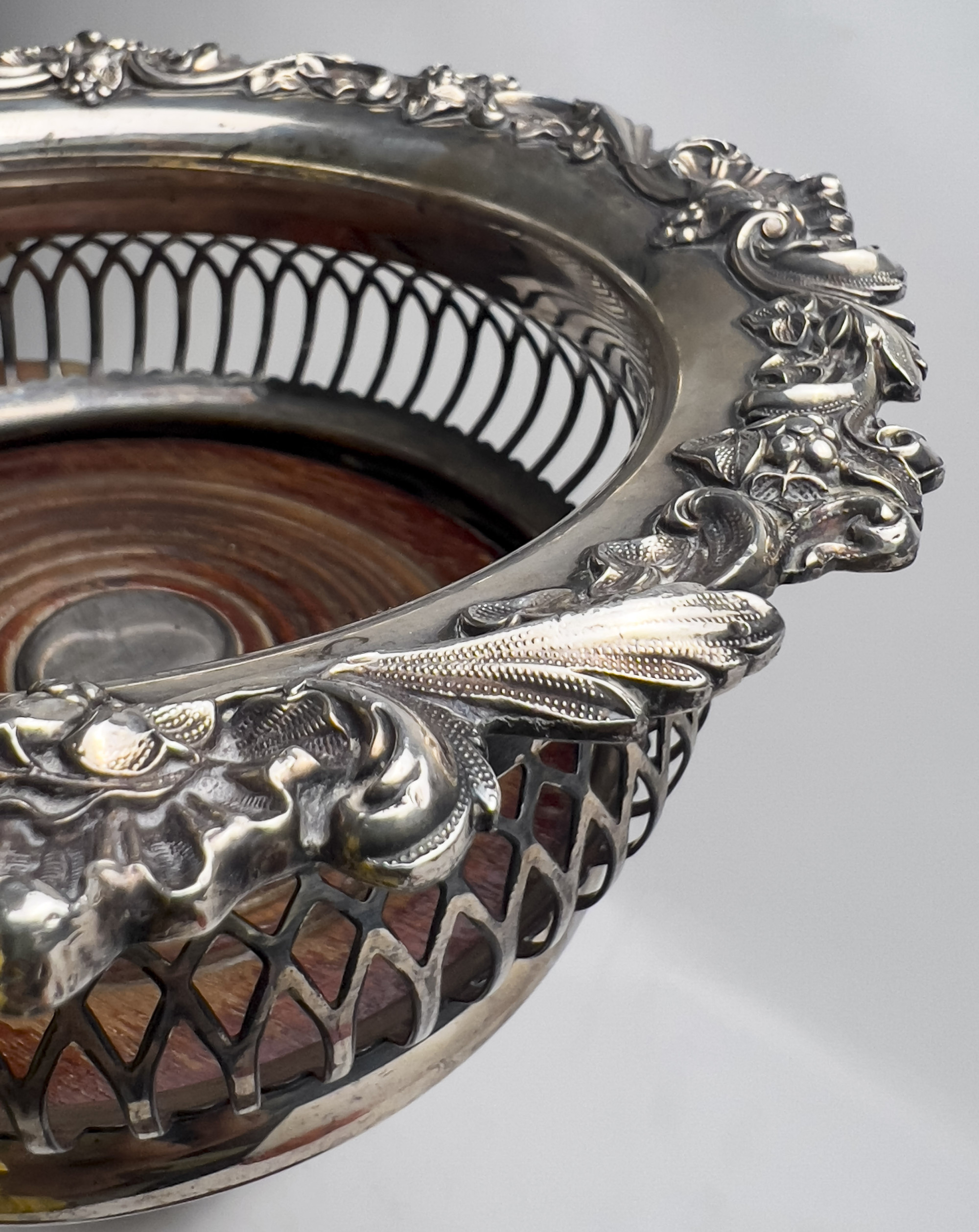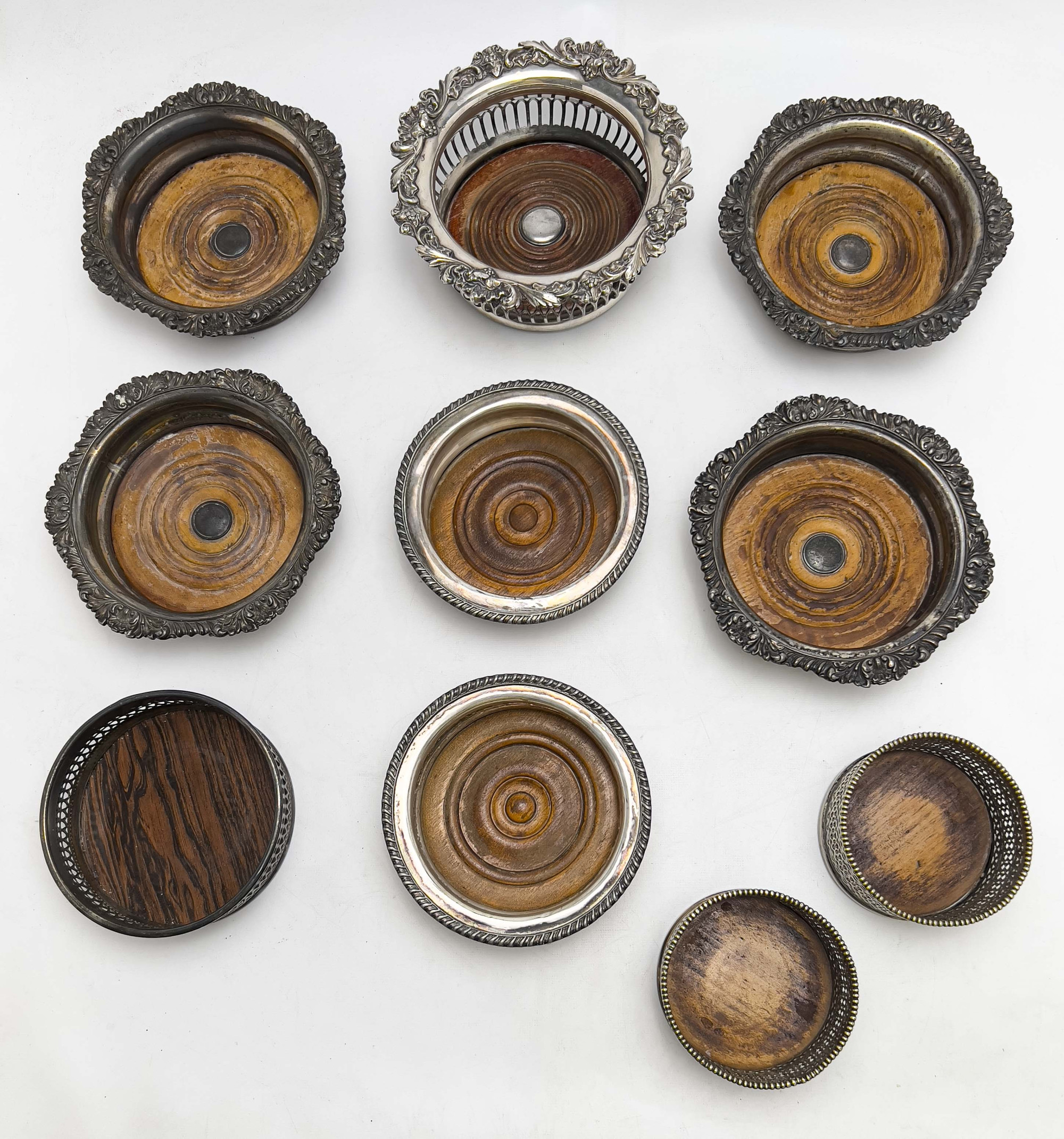 Comprising ten silverplate and wood wine coaster, of varying sizes, several with pierced sides and decorated rims