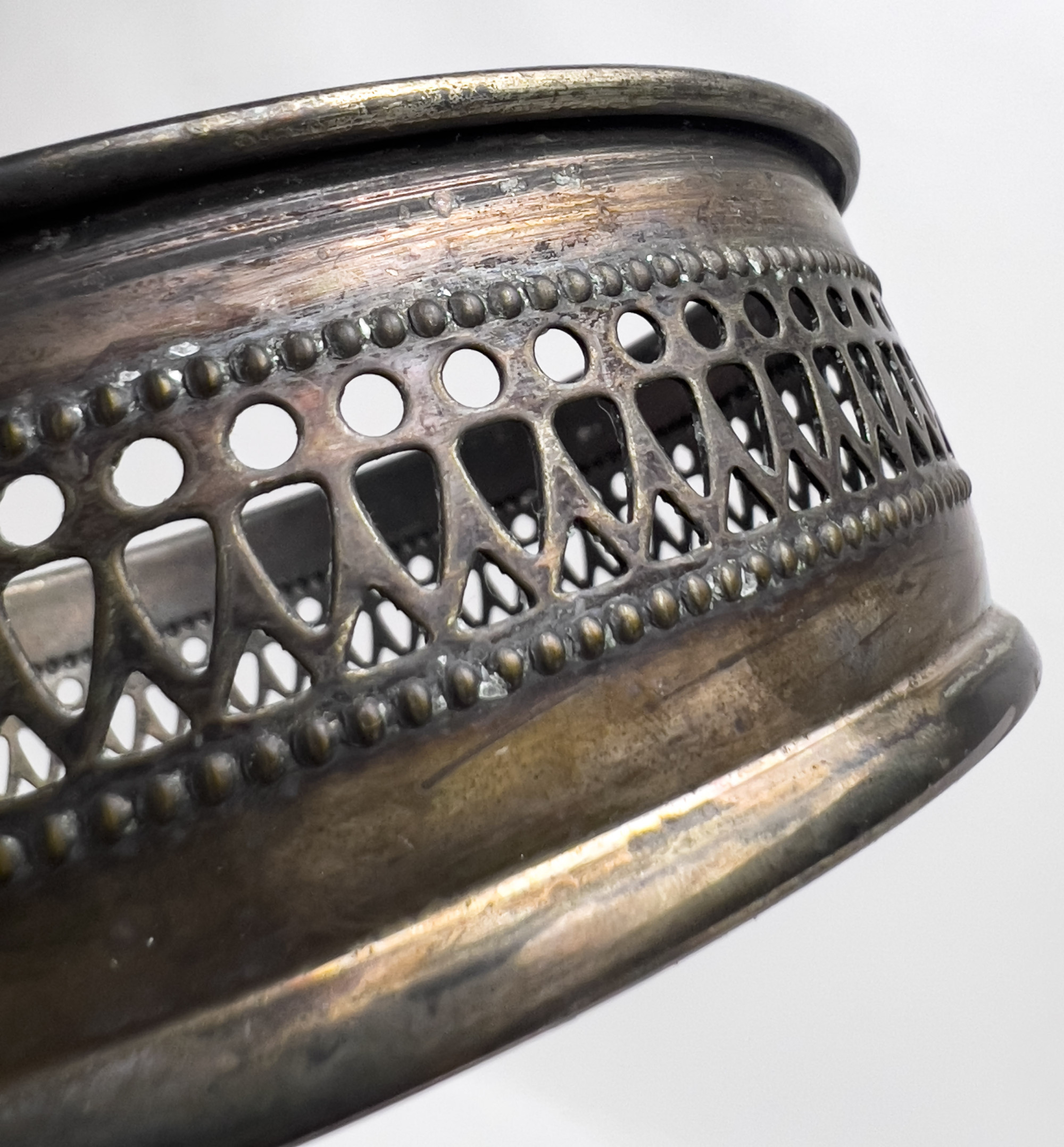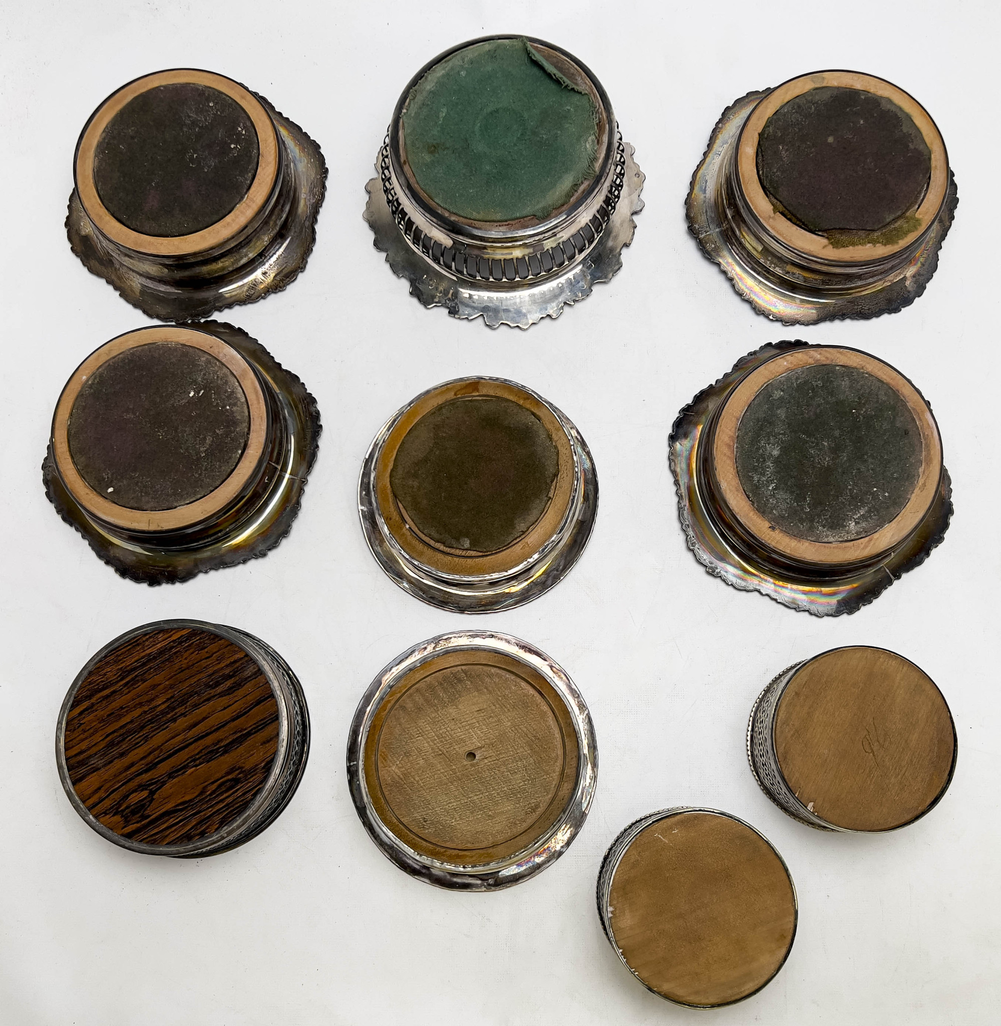 Comprising ten silverplate and wood wine coaster, of varying sizes, several with pierced sides and decorated rims