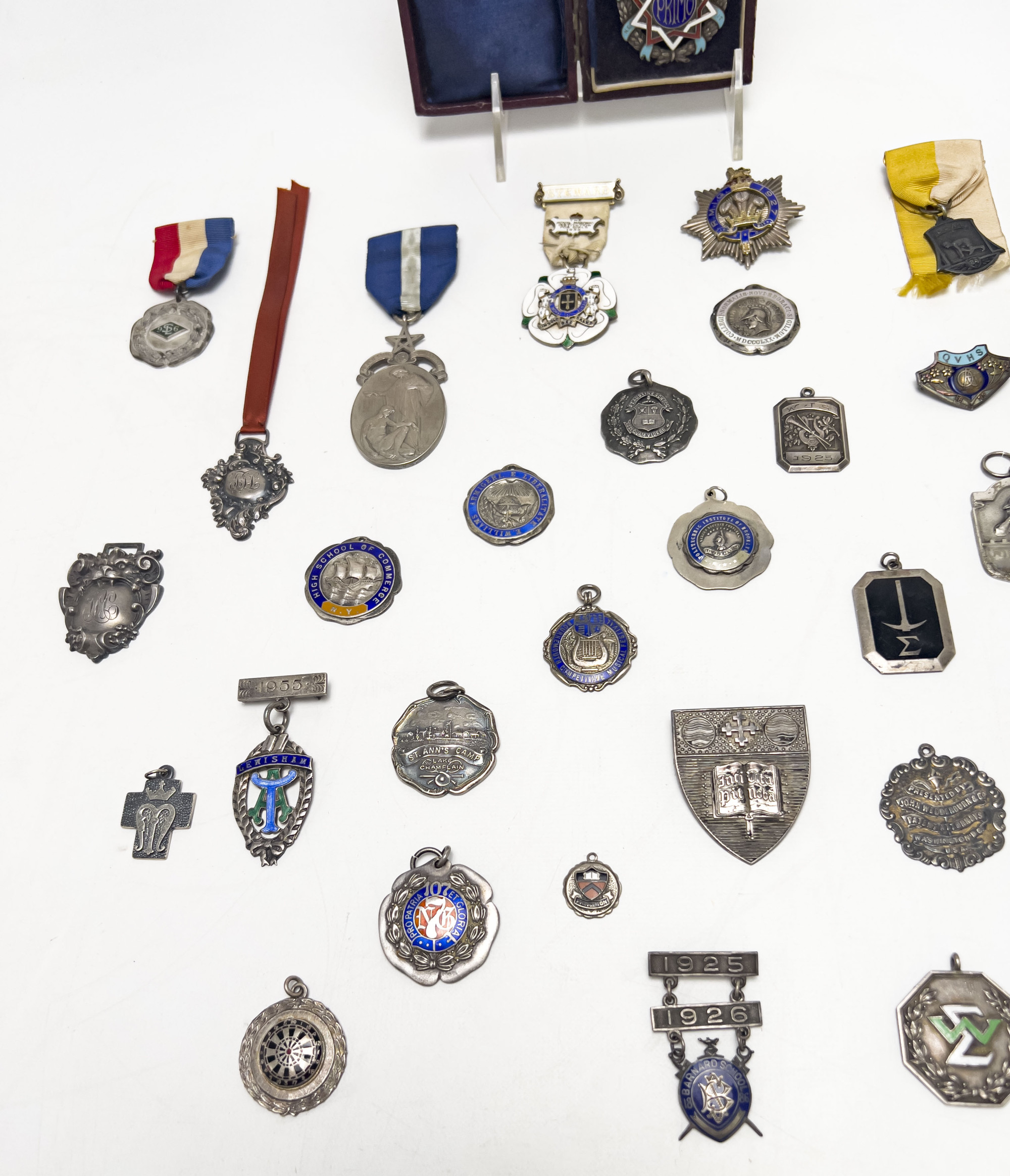 Comprising various medals, some with enamel, all sterling except for the target. The approximate weight of the sterling medals is 500 gm