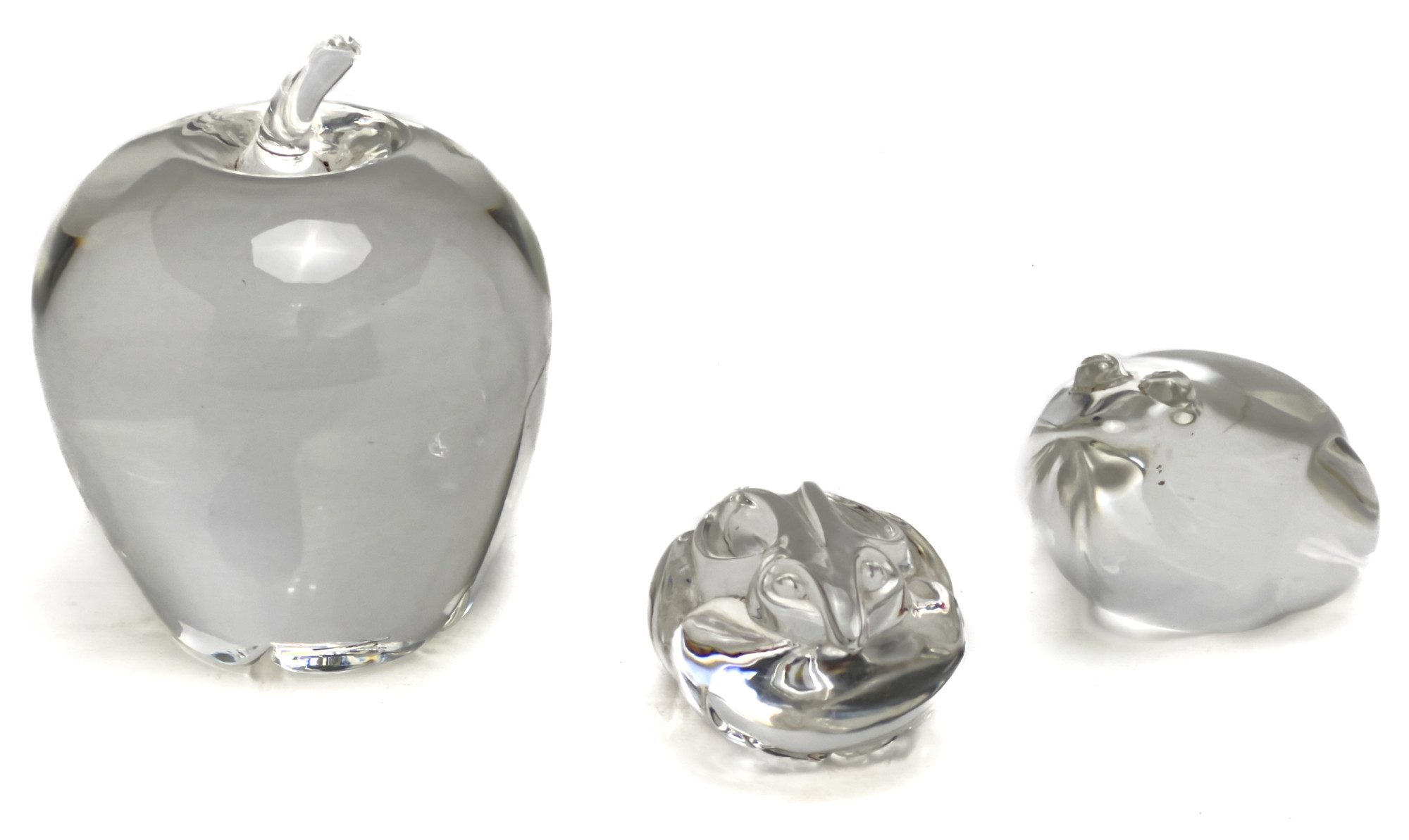 Comprising three glass center bowls, two glass frog shaped paperweights, and one apple paperweight